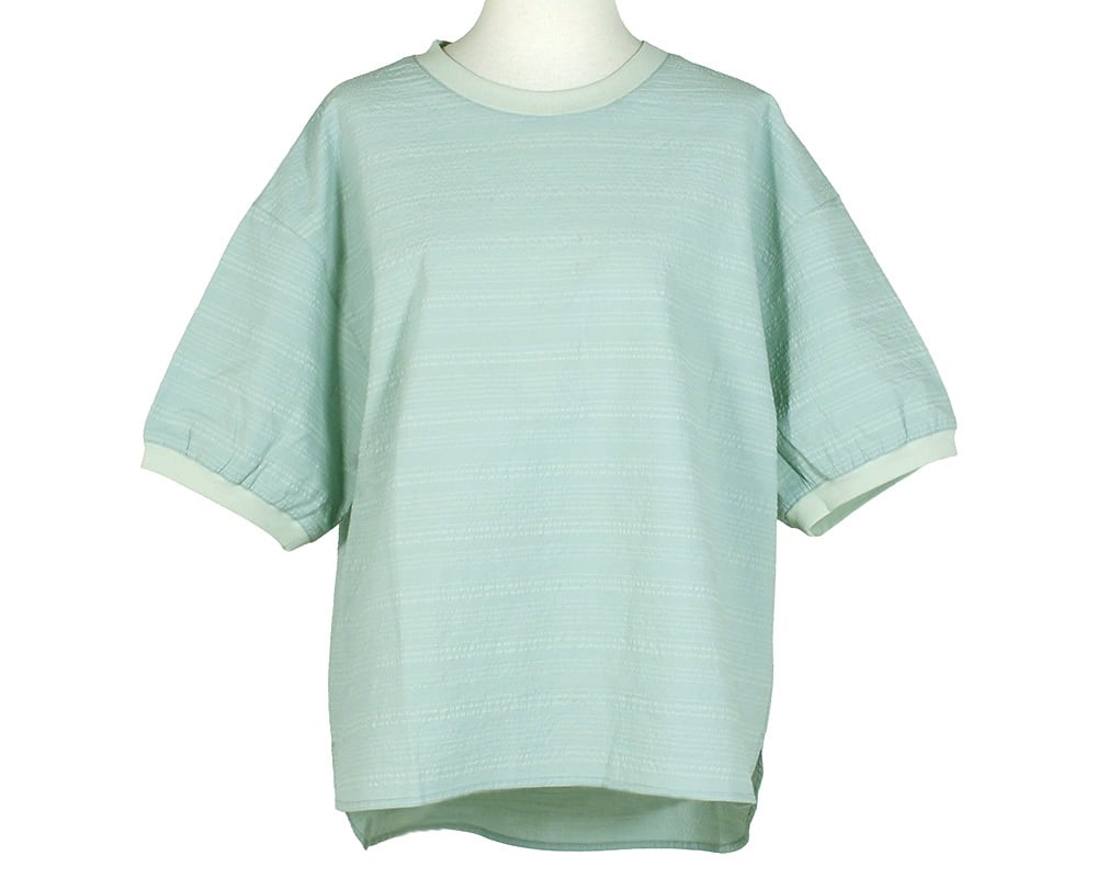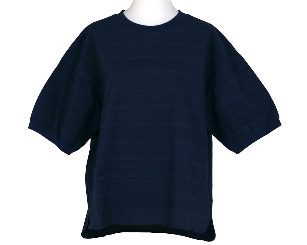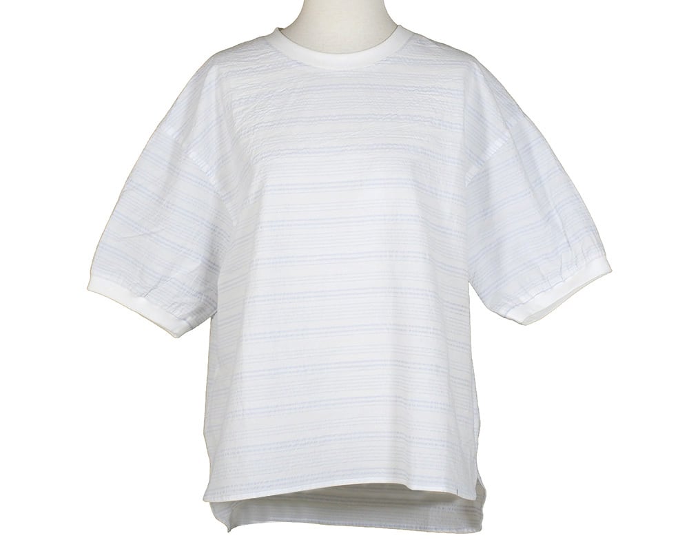 楽ちんながらもカジュアルすぎず、ほどよい上品感漂うTブラウスです。凸凹感のある綿100%のサッカーボーダー柄で、さらっと心地よく着ていただけます。後の襟ぐりには「素晴らしい一日」という意味の彫り柄入りロゴプレートを付けて、後ろ姿も様になるようにしています。
