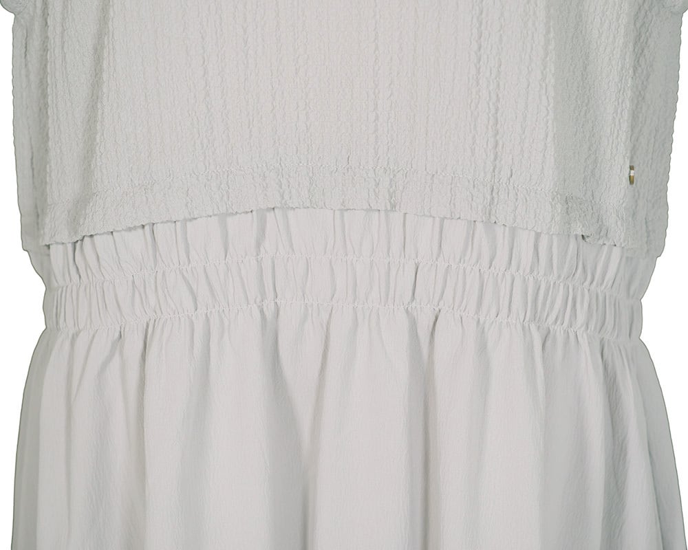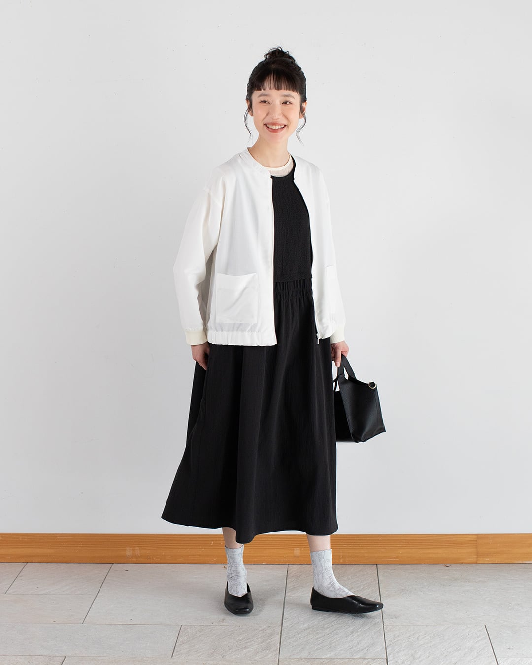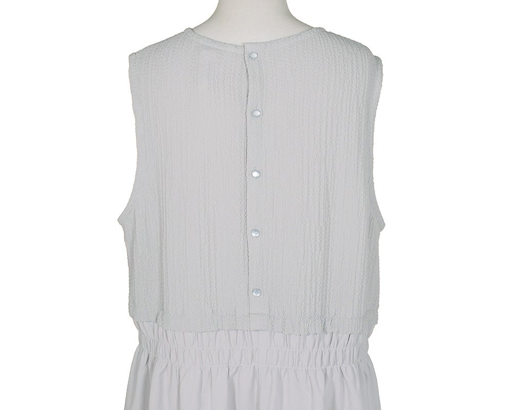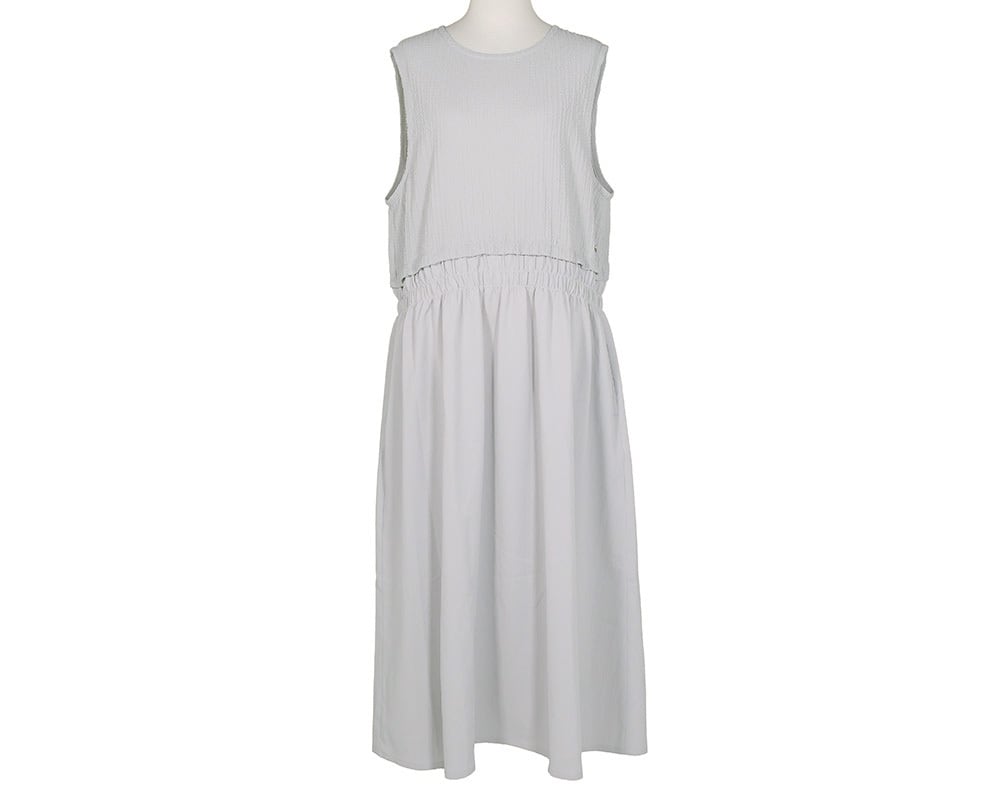 1枚でさらりと着こなしが決まるノースリーブワンピースです。上身頃はシャーリング生地、スカート部分は表面変化のある生地を使用しました。ウエストのシャーリングギャザーがポイントです。