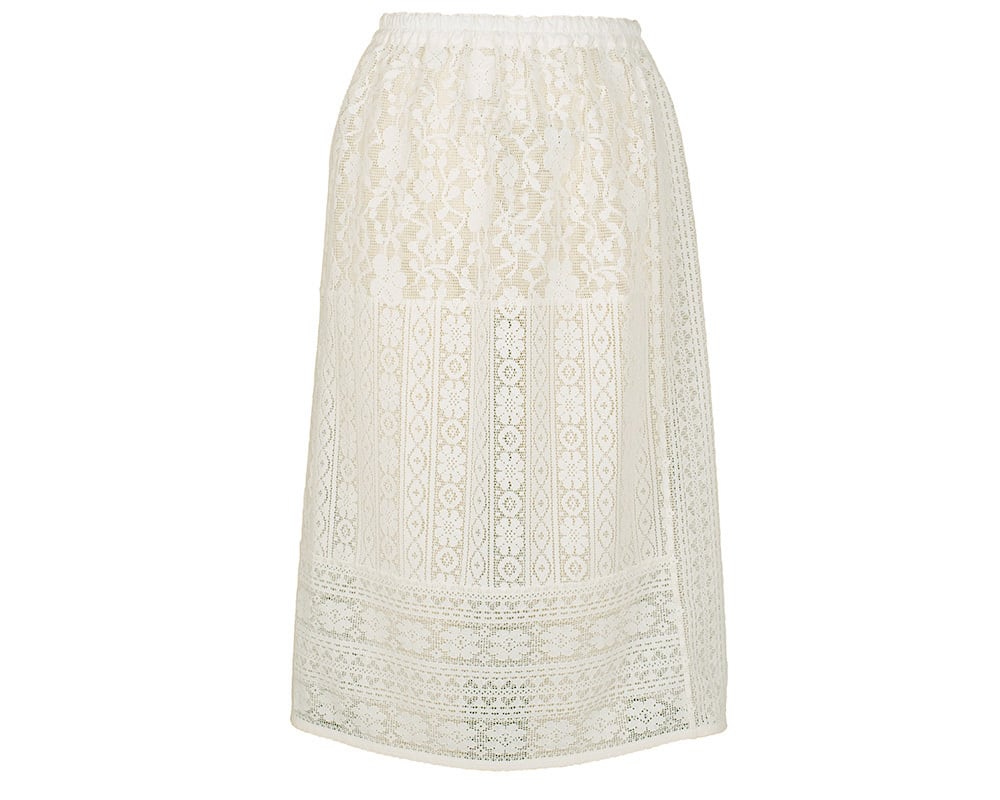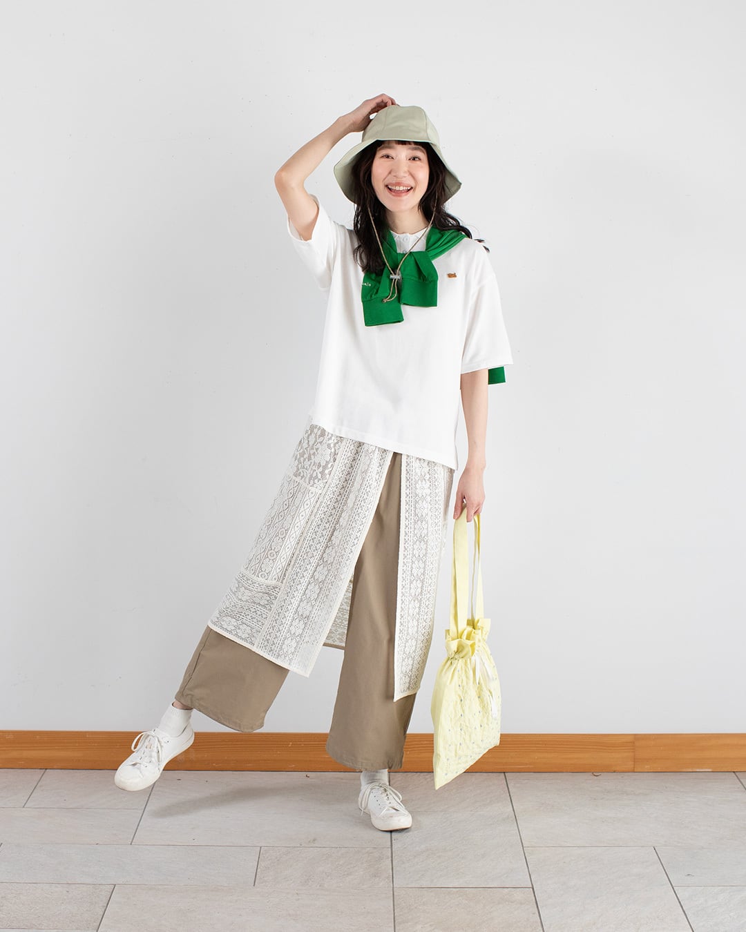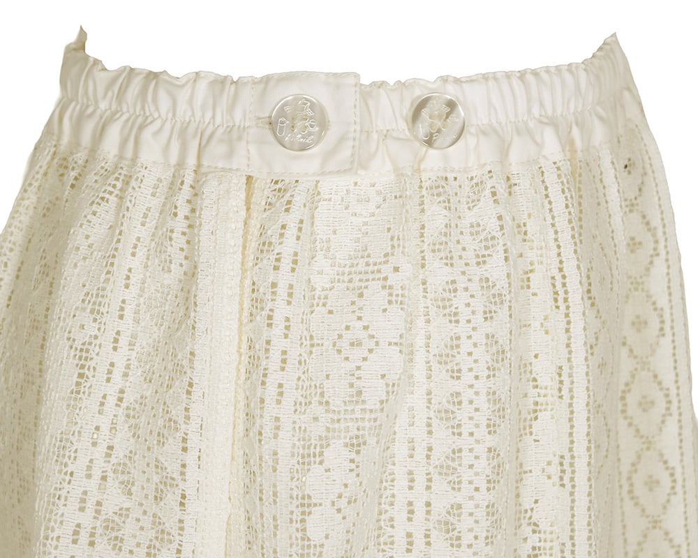 パッチワークレースを重ねた巻きスカートで、パンツの上に合わせるレイヤード用のスカートです。パッチワークレースのキャミソールと合わせるとオシャレ度がさらに高まります。型崩れしにくい3種類のレース柄を切り替え、動くたびに表情が出る仕上がりになっています。