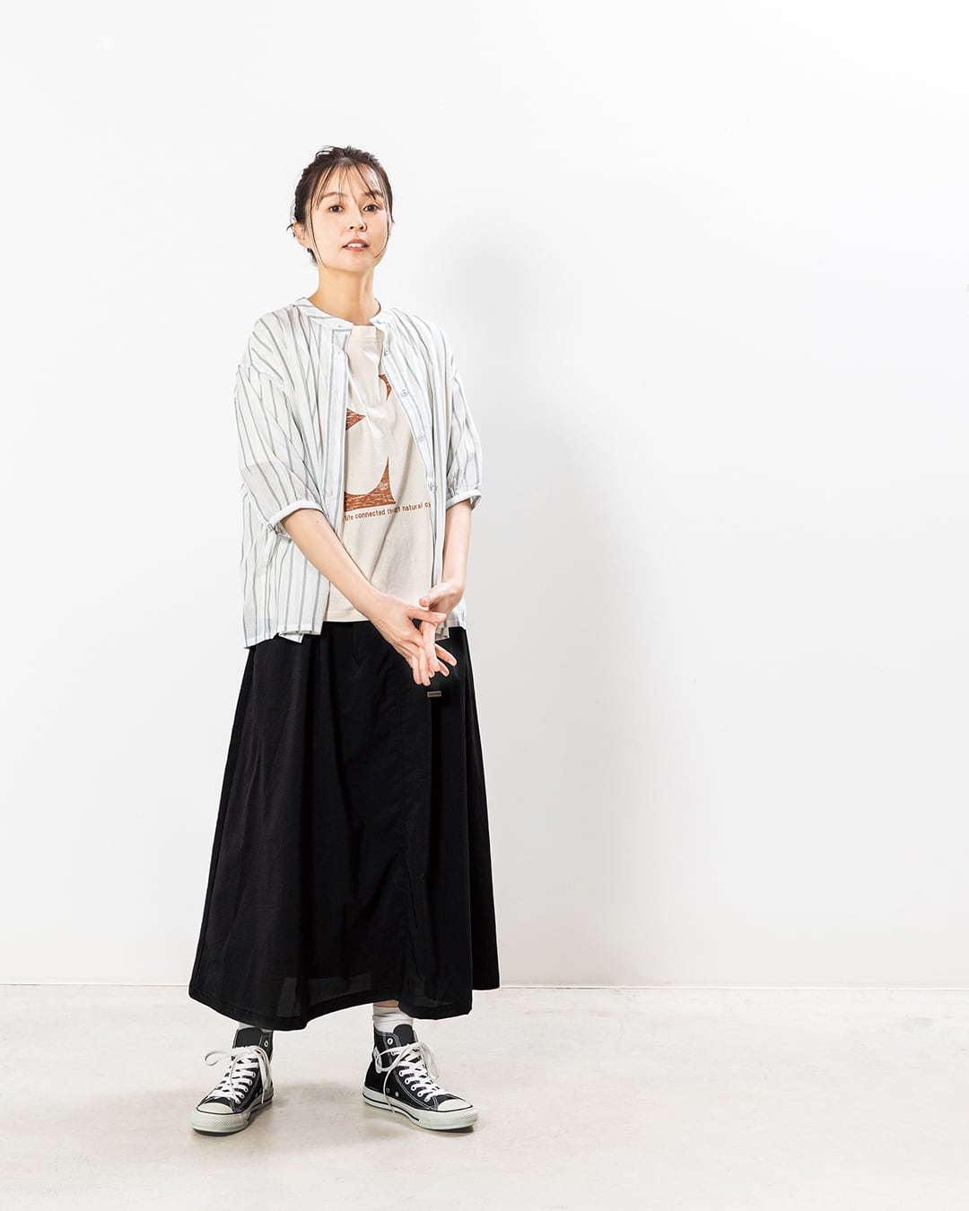 ソロテックス素材を使用した、快適さと上品さを兼ね備えたスカート。軽量でしなやかな風合いに加え、優れたストレッチ性と形態安定性を持つため、動きやすくシワになりにくいのが特徴です。ウエストはゴムとベルト仕様でフィット感を調整でき、デイリーに心地よく着用できます。フロントの切り替えラインが立体的なシルエットを生み、両サイドのポケットが実用性をプラス。幅広く着合わせが出来、季節を問わず活躍する万能アイテムです。