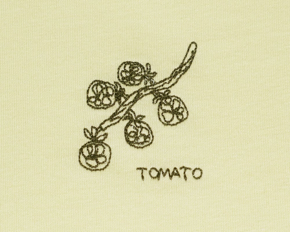 収穫したトマトと豆をモチーフにした、少し小さめの刺繍をフロントにあしらったタンクトップ。