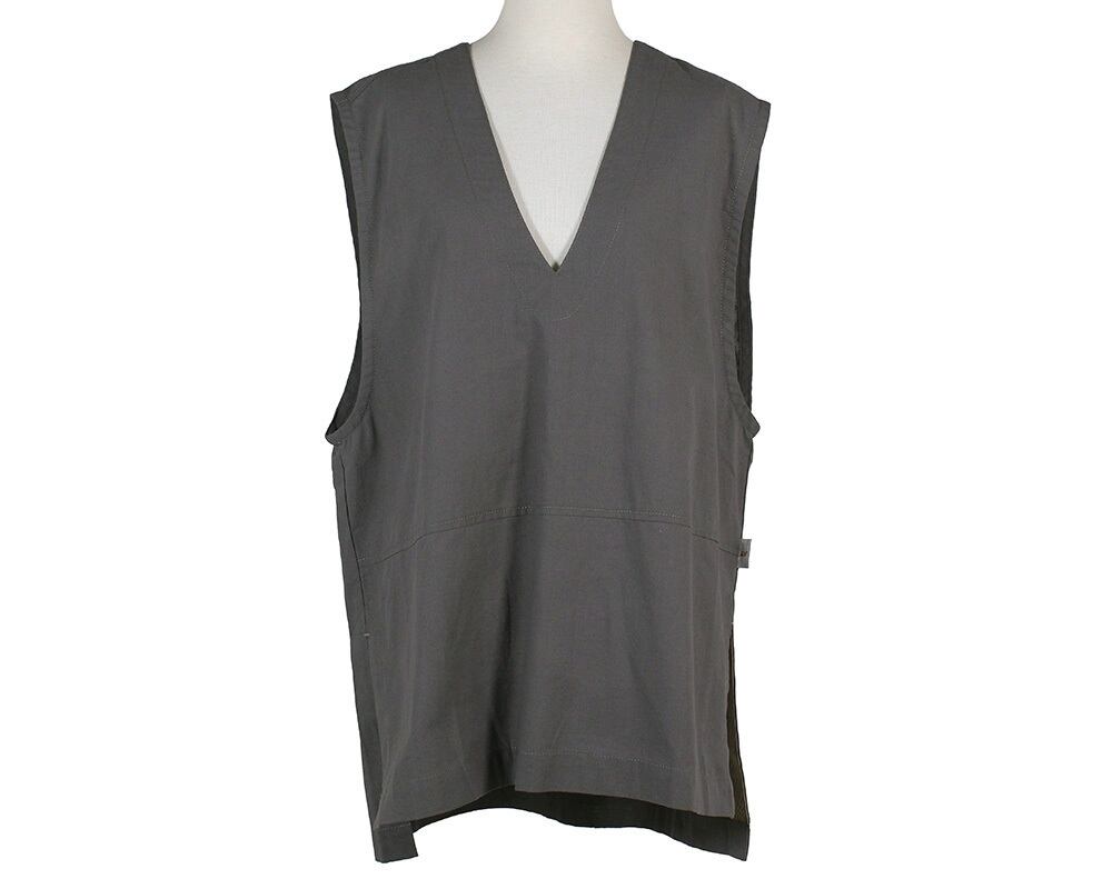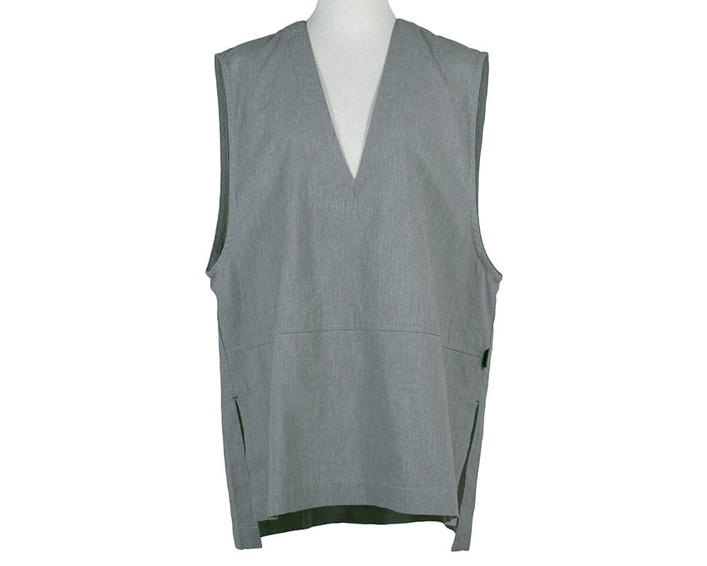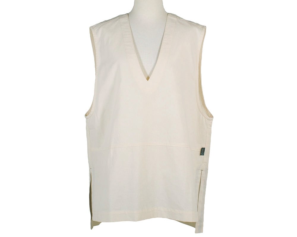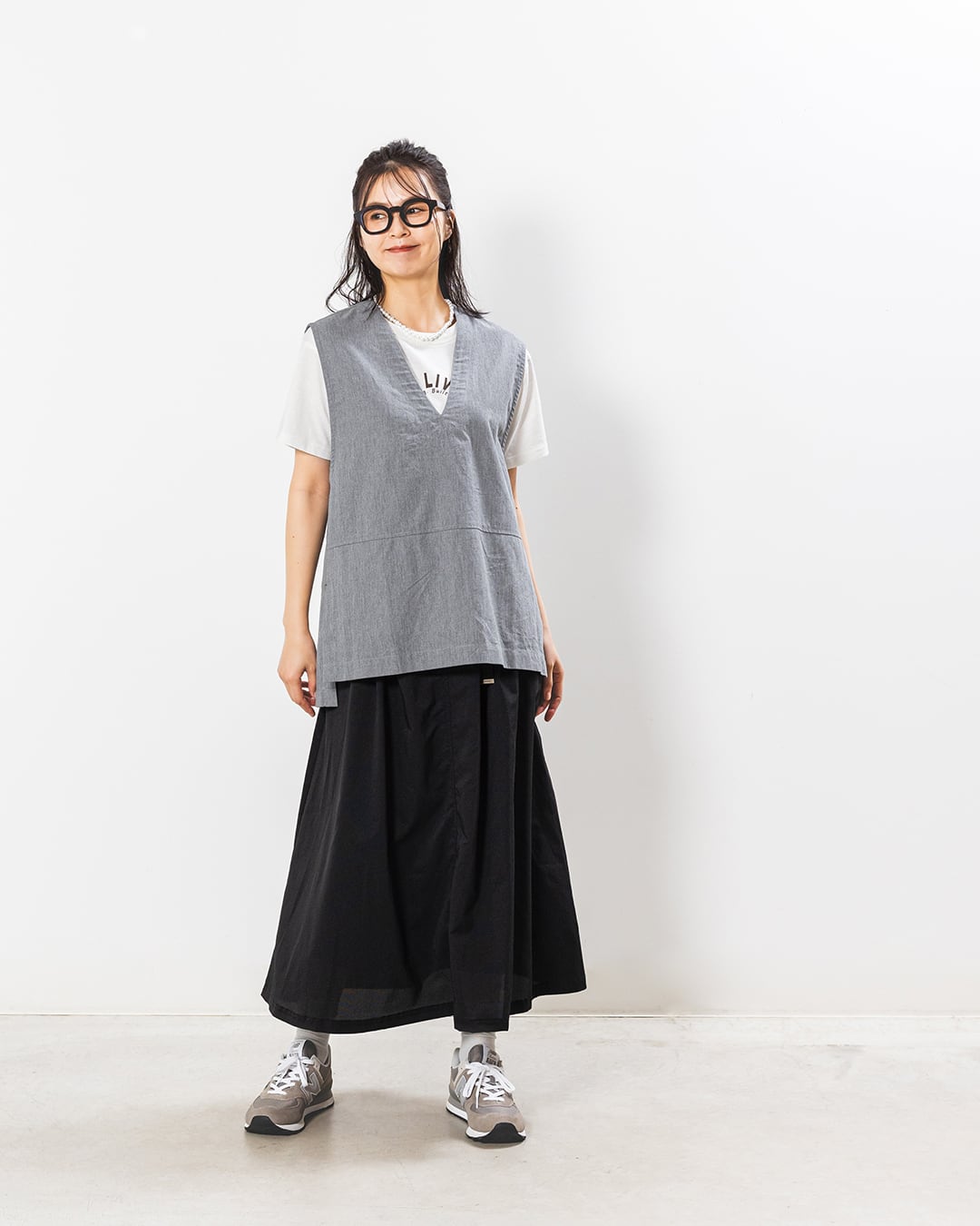 程よい深さのVネックが首元をすっきり見せる布帛のベスト。身頃には切り替えを入れ、シンプルながら立体感のある表情に仕上げています。サイドには動きやすさを高めるスリットを施し、裏側にストライプのテープ使用し、さりげない遊び心とアクセントをプラス。軽やかな着心地でレイヤードにも最適なデザインです。