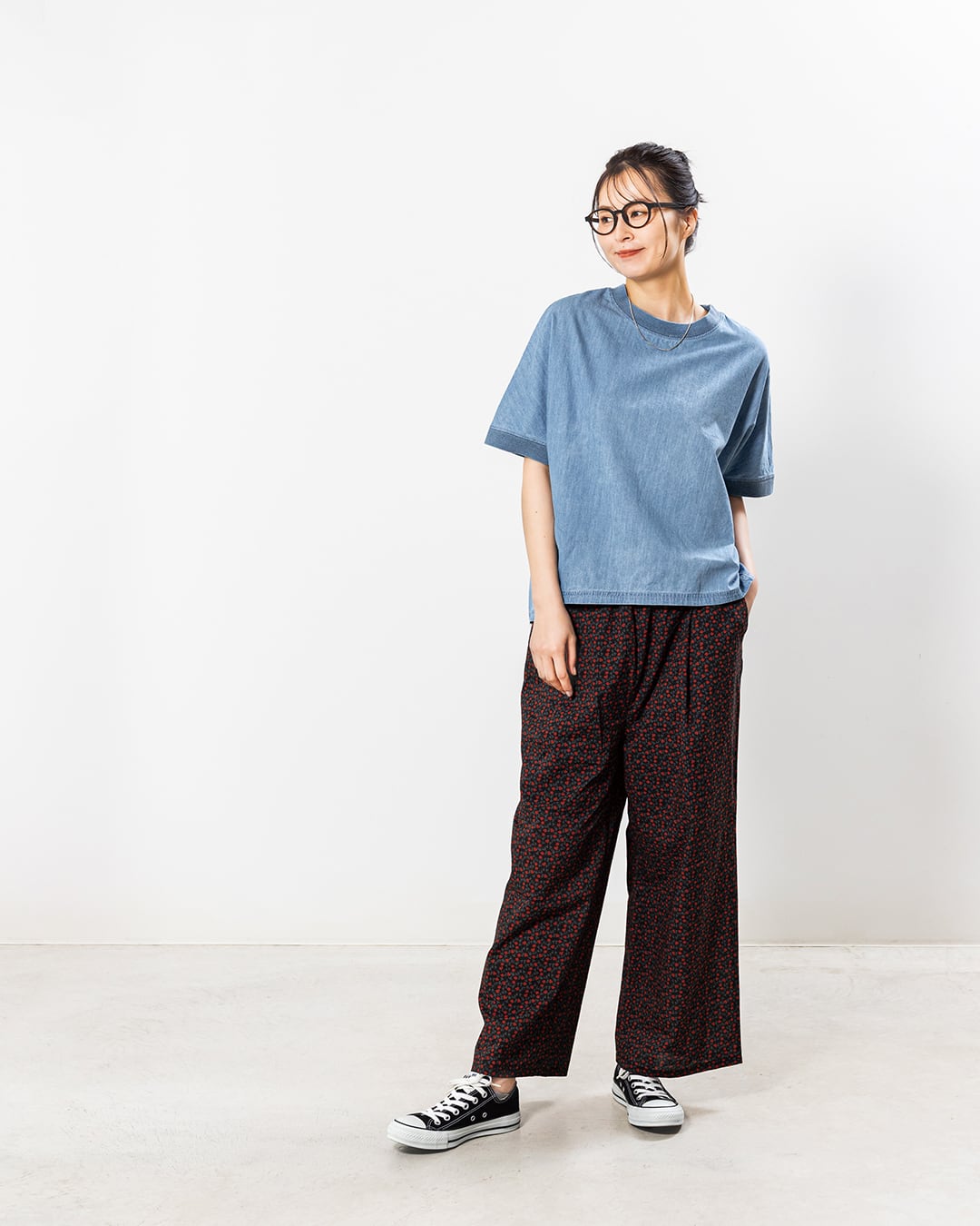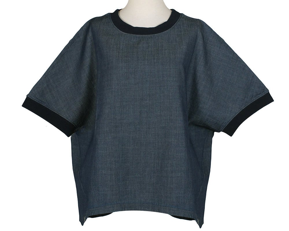 ワイドシルエットのプルオーバーに、デニムとツイルの2素材をカラーごとに使用。