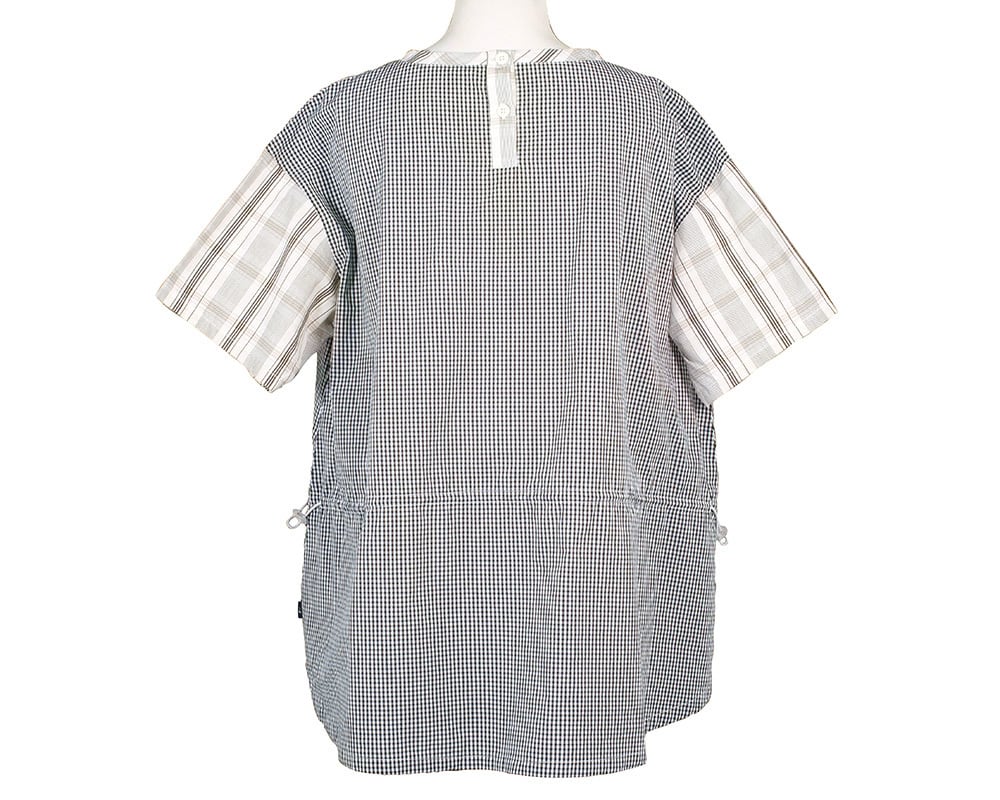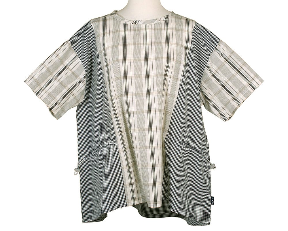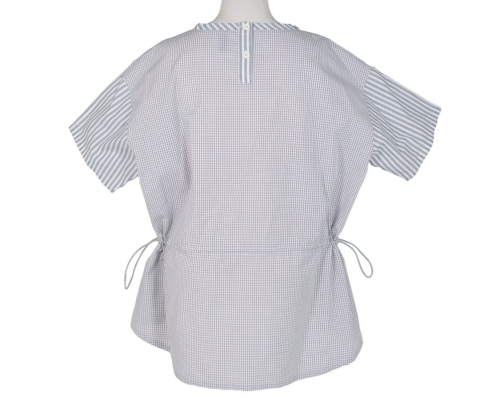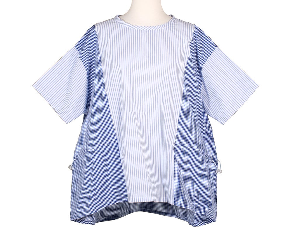 ストライプとギンガムチェック、異なる柄を組み合わせたデザインが目を引くプルオーバー。
