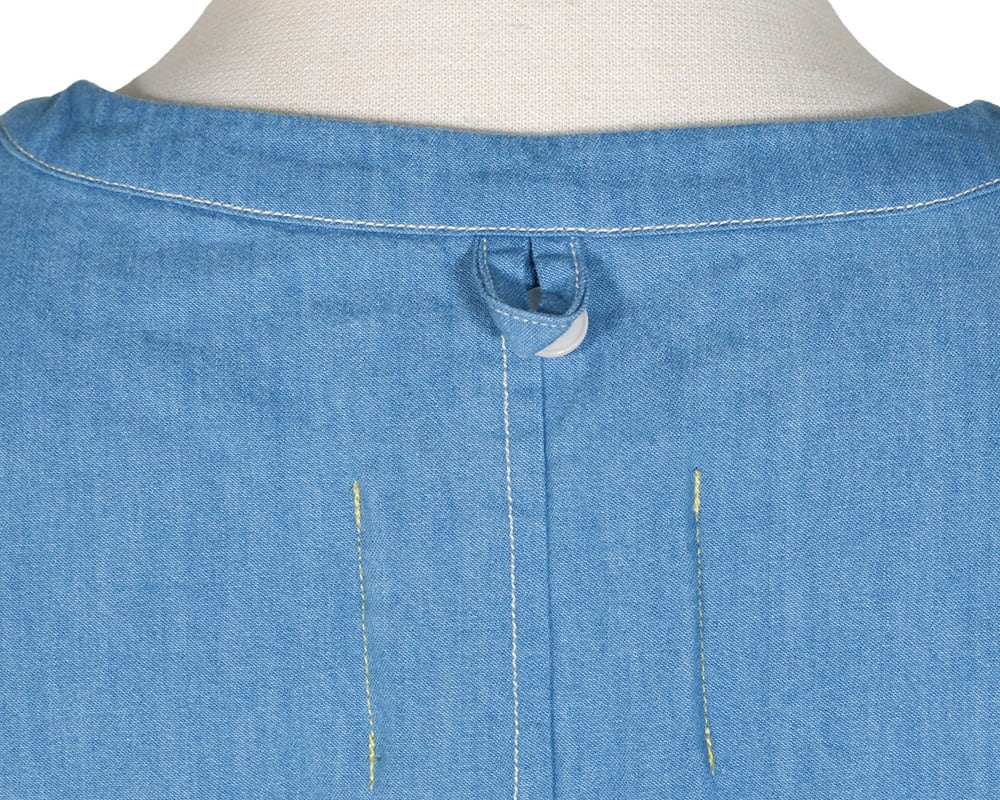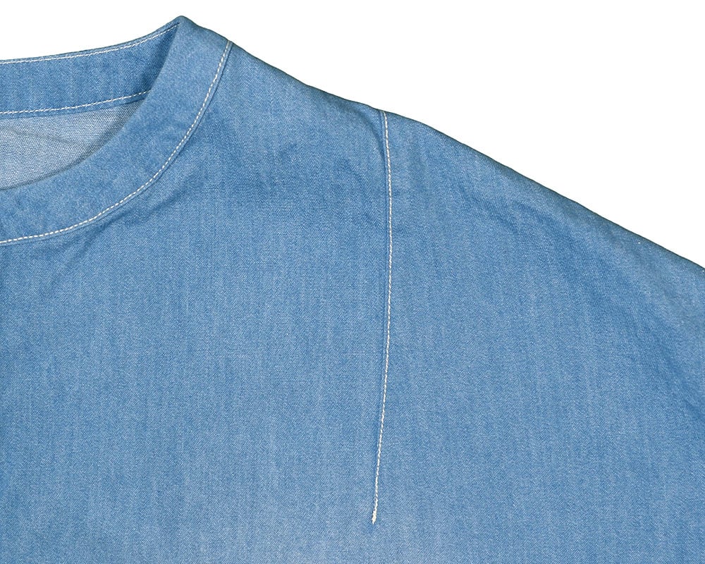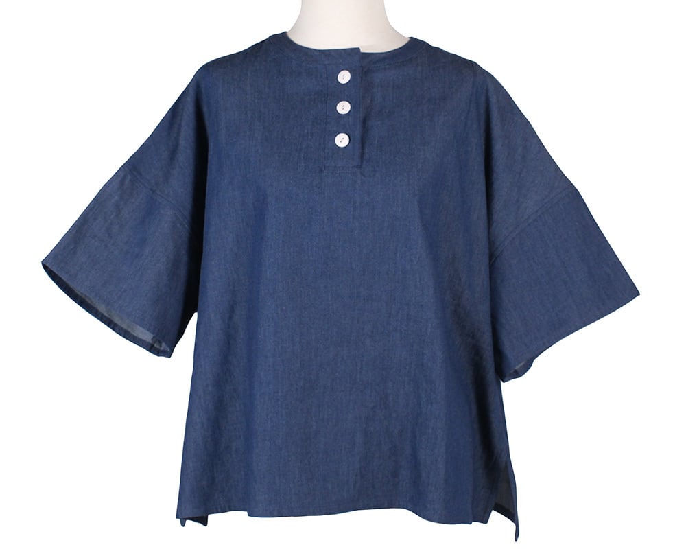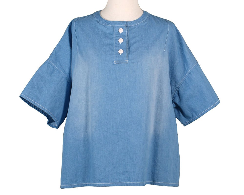 ライトオンスデニム、ライトオンスツイル素材を使用したヘンリーネックプルオーバー。