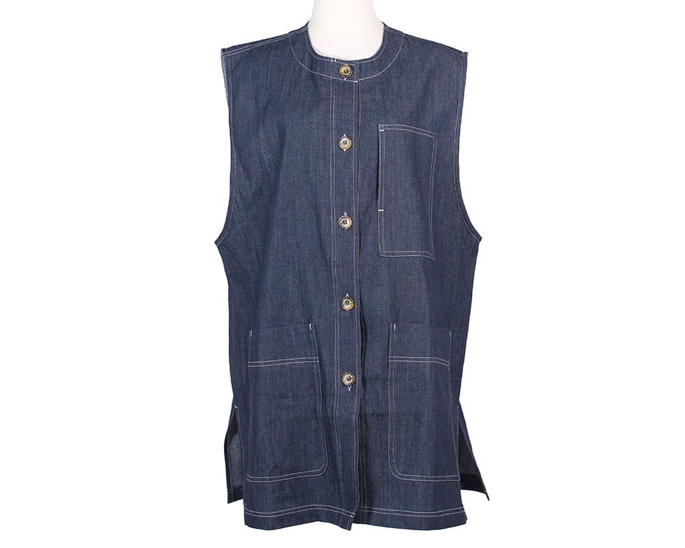 デニムと無地の2タイプで展開するノーカラーロングベスト。すっきりとした首元がレイヤードを引き立て、シャツやカットソー、ワンピースなど幅広いアイテムと好相性です。ロング丈が縦のラインを強調し、軽やかな着心地で季節を問わず活躍します。コーディネートのアクセントになるアイテムです。
