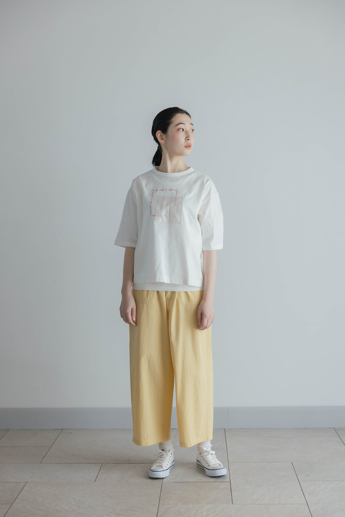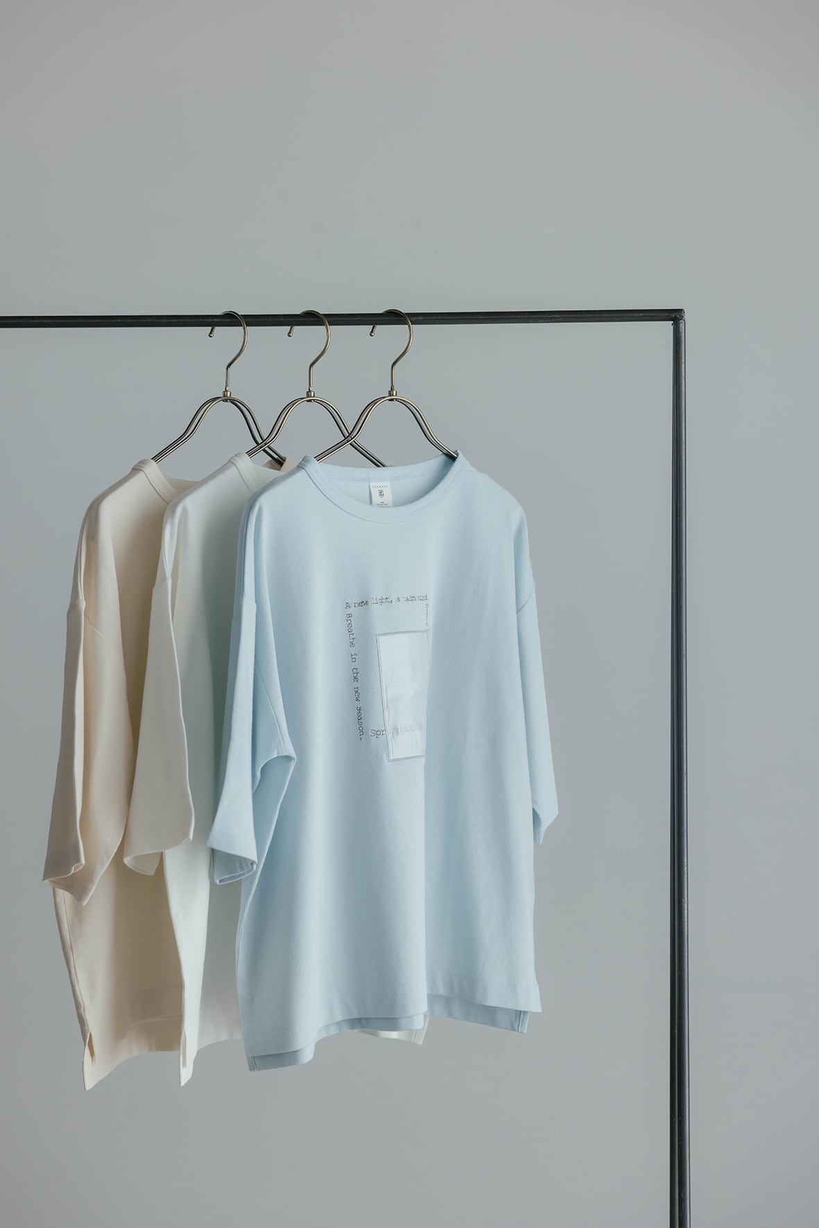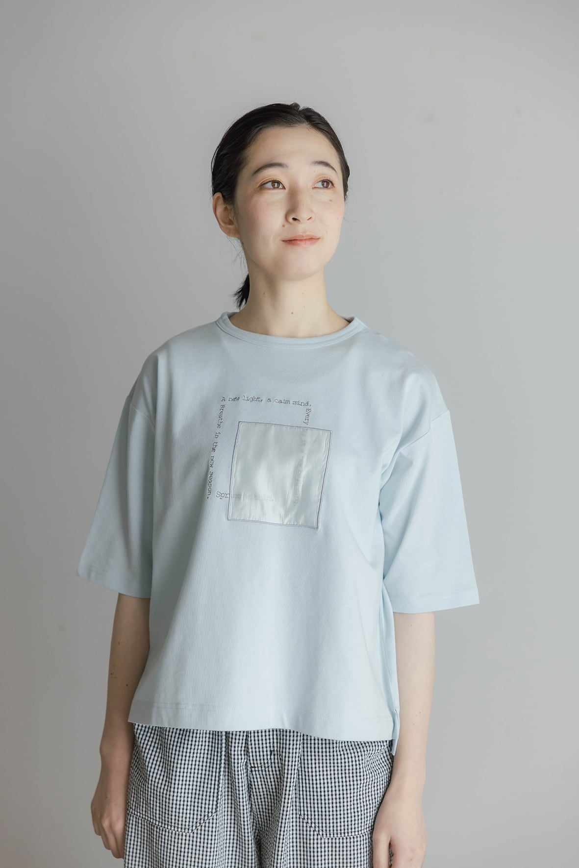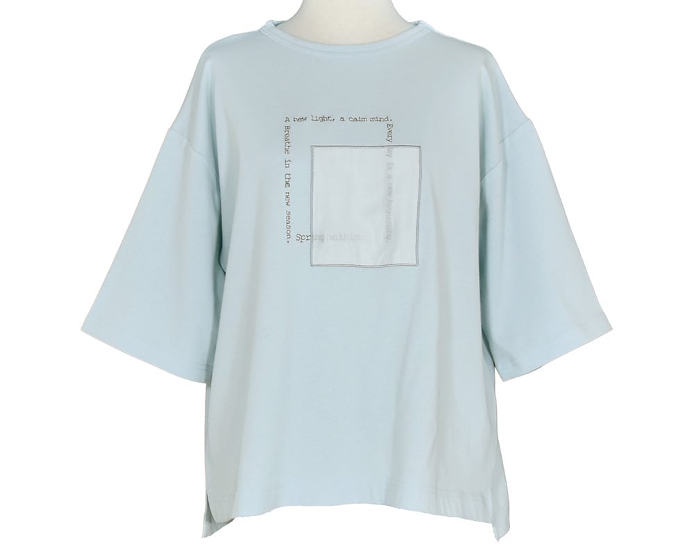 ロゴ刺繍にオーガンジー素材を重ねたデザインのTシャツです。二の腕をカバーできる長めの袖丈が、安心感のあるデザインです。刺繍ロゴは、新しい季節である春の到来をイメージしたフレーズです。(日本語訳「毎日を新しく。新しい光と穏やかな心。新しい季節の空気を感じて。心の中に春を。」)・透け感が気にならない程よい厚みと、肌触りがよく取り扱いしやすい丈夫なリラシク定番のコットン天竺素材です。