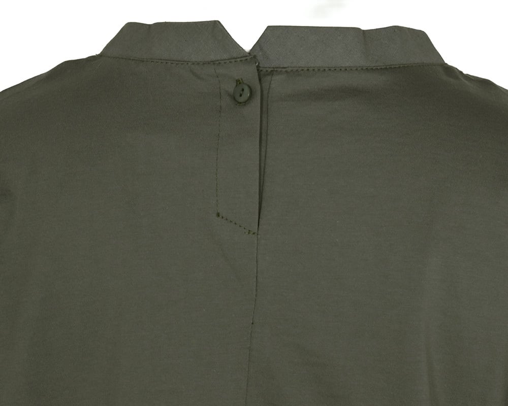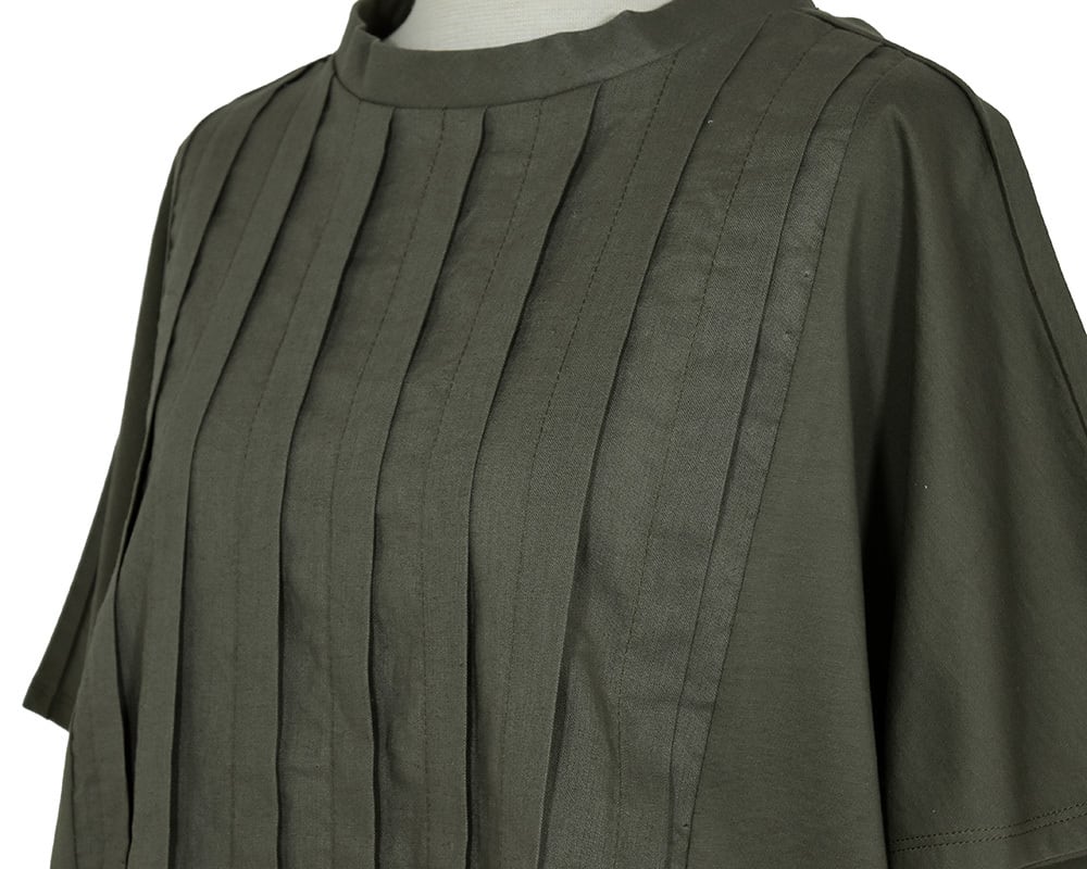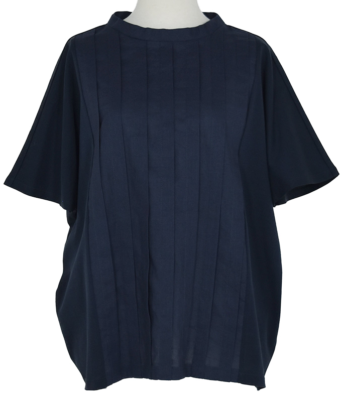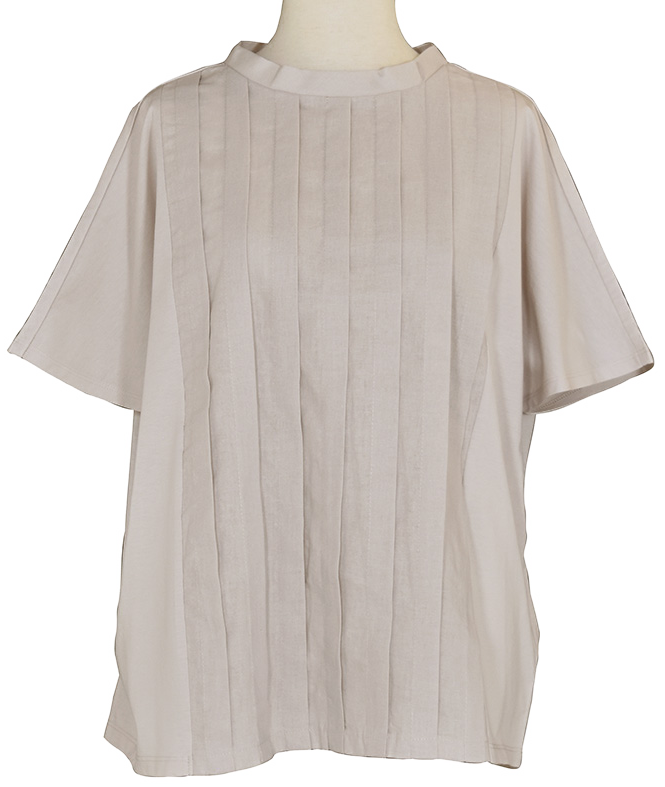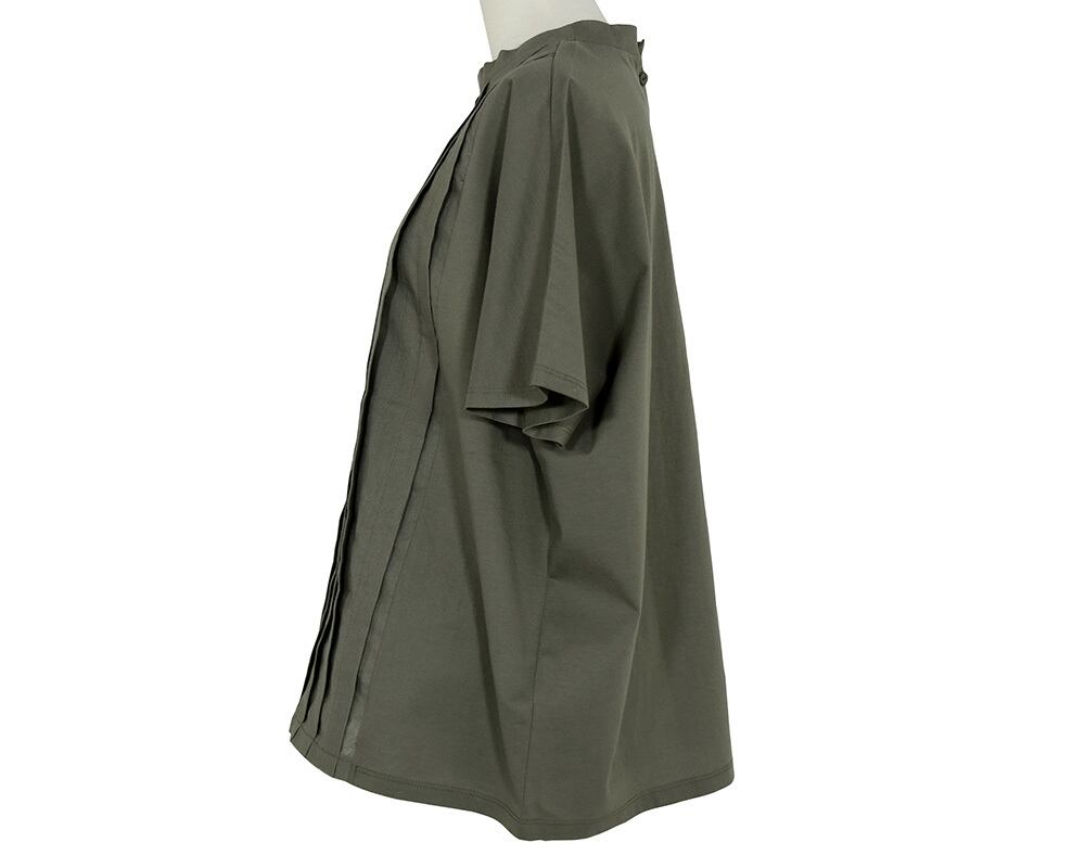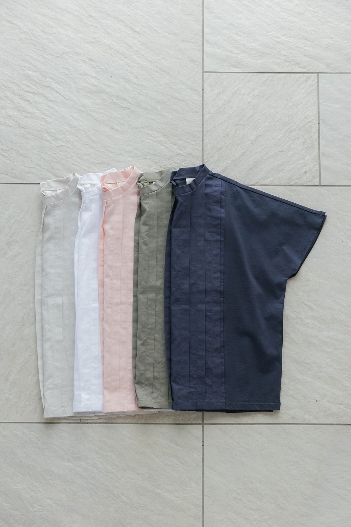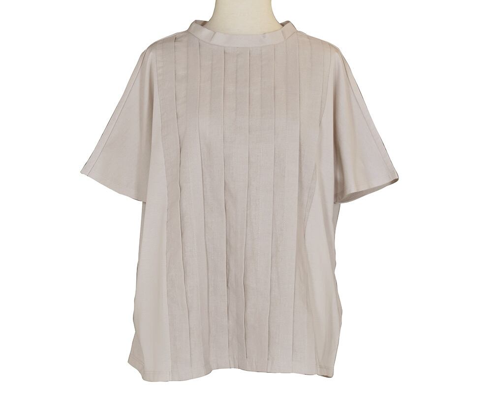 毎年ご好評いただいている布帛タック切り替えのカットソーです。前身頃に布帛を配したことでブラウスのようにきれい見えし、カジュアルすぎない上品な印象に仕上げています。後ろは釦あき仕様で、着脱もしやすいデザインです。天竺ジャージとリネンコットン布帛の2素材を使用。ジャージ部分はシルケット加工で毛羽を抑えた、さらりとした肌触りです。