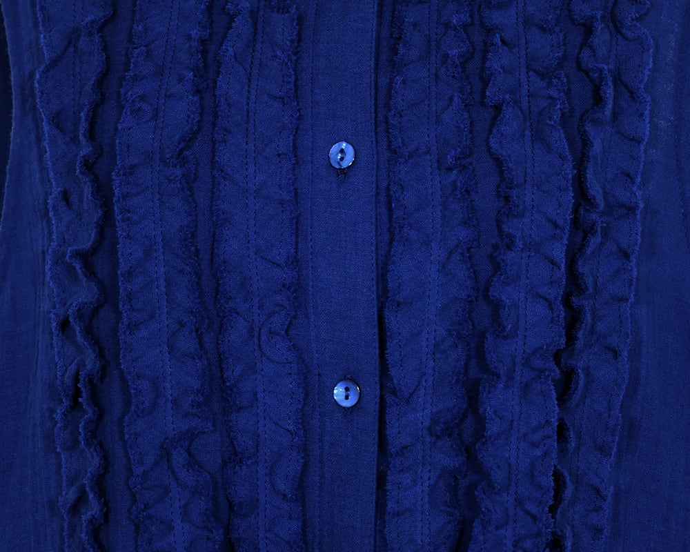 ふんわりと膨らみのある素材感を活かし、フロントフリルが華やかな印象のフレアシルエットのロングジレです。メッシュインナーやTシャツとの相性も良く、釦を外すことでコーディネートに合わせた着こなしを楽しめます。軽くソフトな風合いのダブルガーゼはタテ/ヨコに強撚糸を使い、洗いをかけてシボ感を出した表面感のある素材です。