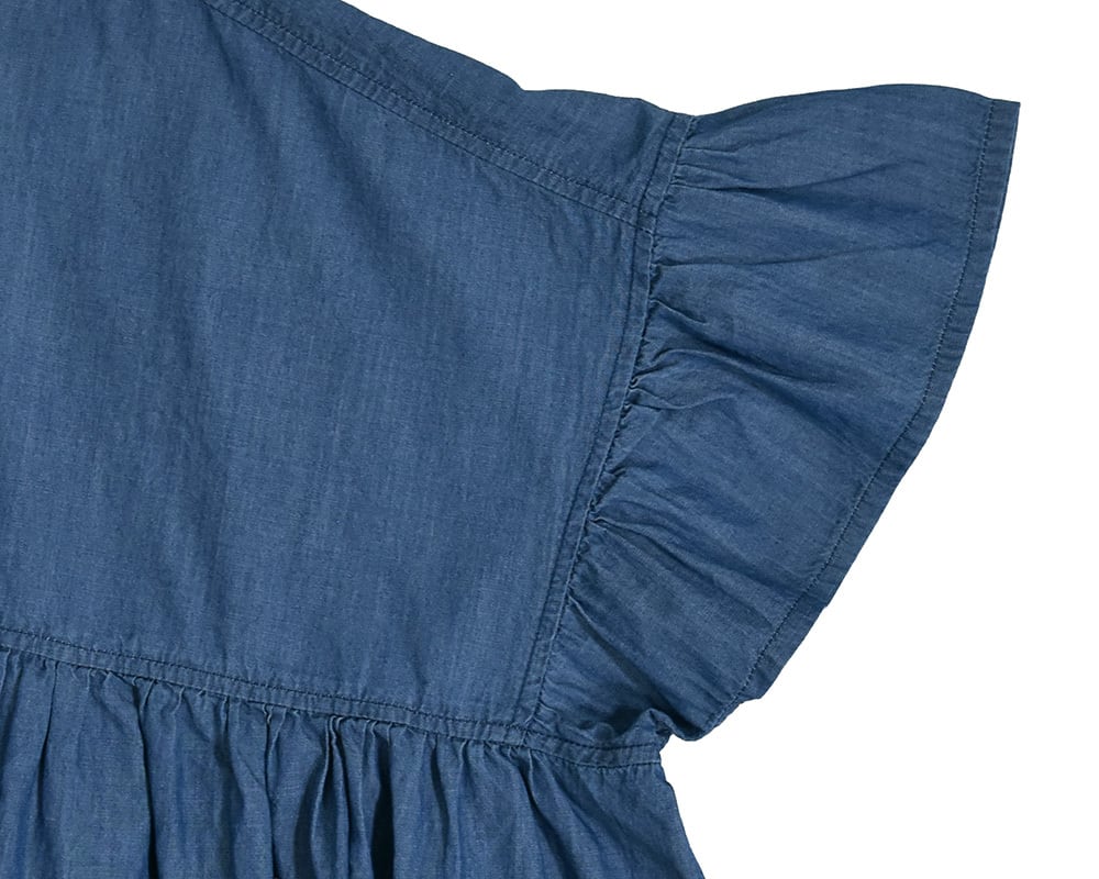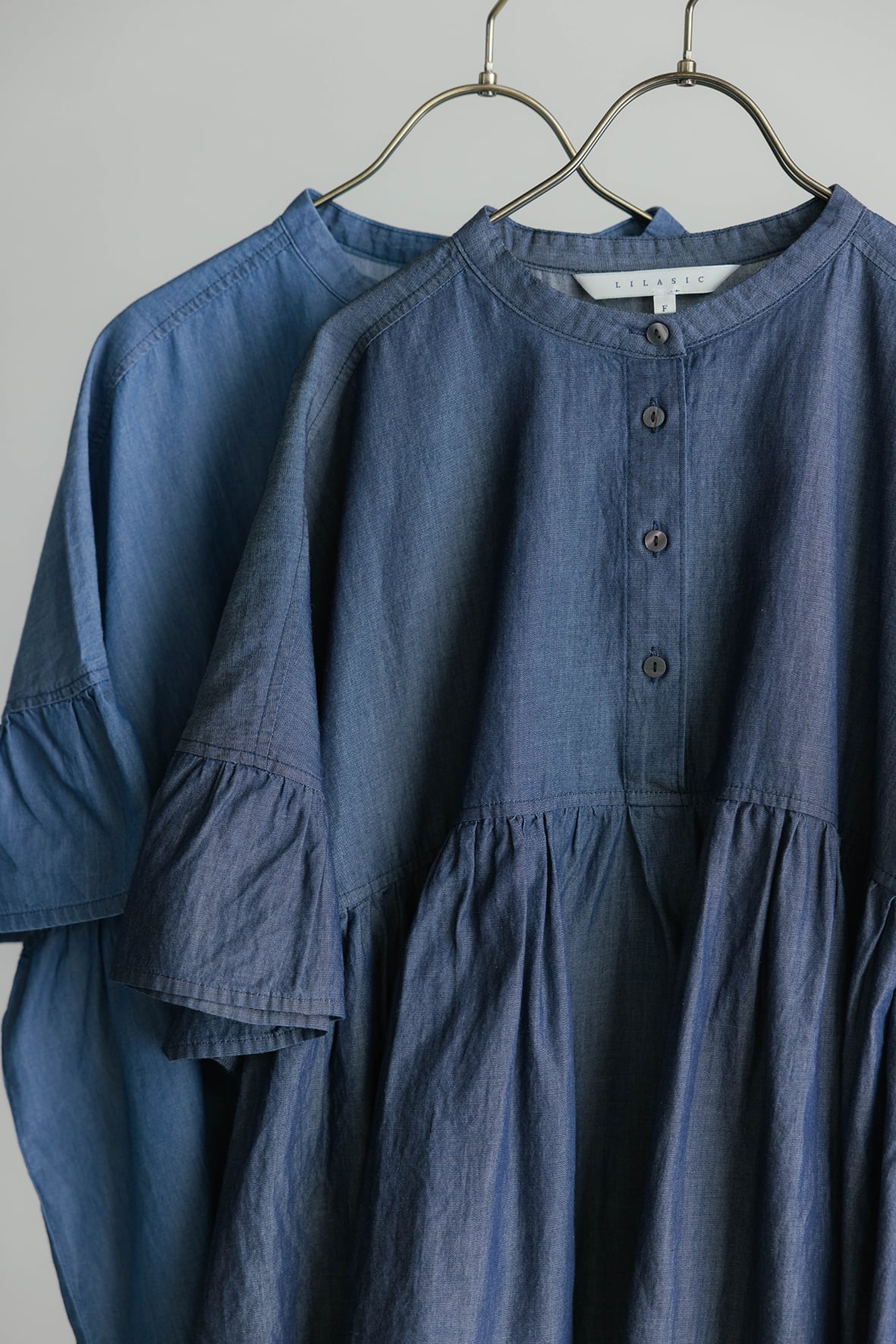 切り替え下にギャザーをたっぷり寄せた、軽やかな印象のスタンドカラーブラウスです。袖のフレアがほどよい女性らしさを添え、前後で長さを変えた裾に動きのあるデザインです。前立てのボタンがさりげないポイントになっています。薄手で柔らかな3.8オンスのライトデニムを使用しています。軽さがあり、デニム特有のごわつきが少ないため、快適に着用いただける素材です。