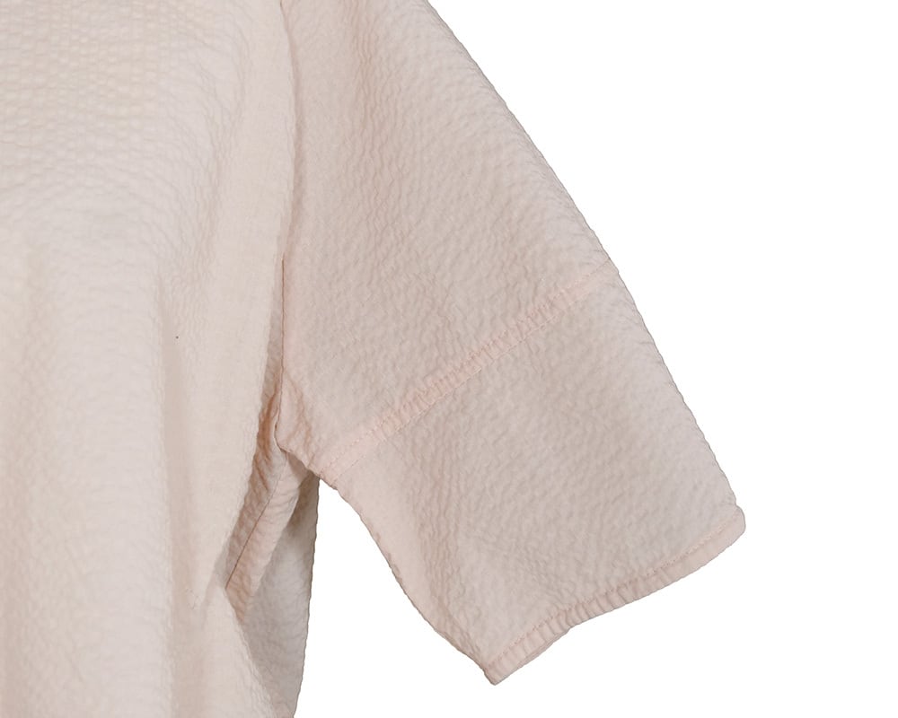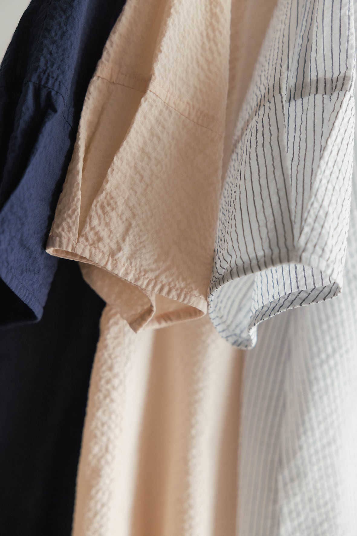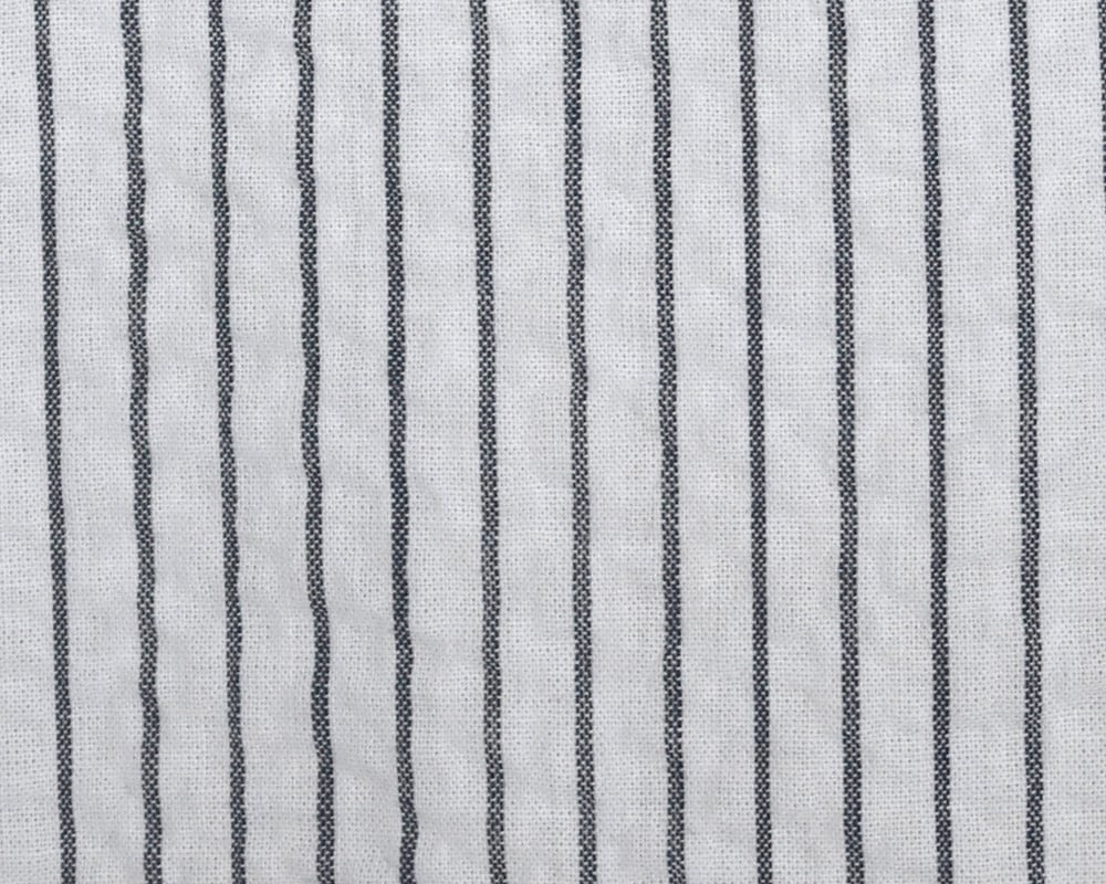 コットン素材にストライプ状の凹凸を施したリップル素材です。軽やかでシワが目立ちにくく、扱いやすいのも嬉しいポイントです。先染めストライプと無地を揃えた、全3色展開です。