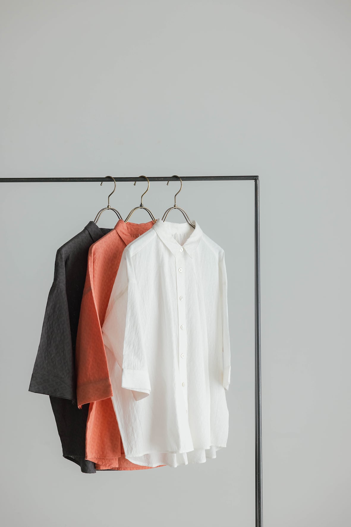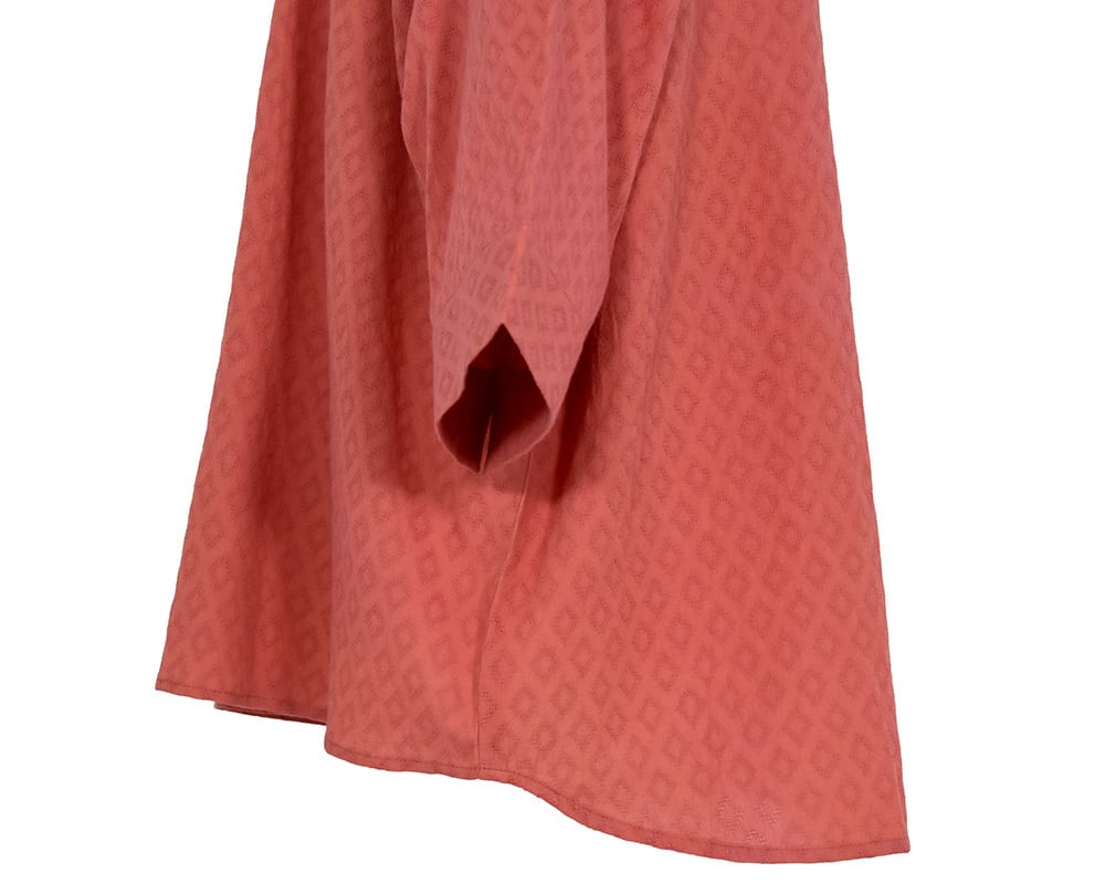 フロントのタックがすっきりとした印象の衿つきシャツです。袖口はやや広めのデザインで、肘が隠れる5~6分袖、安心感のある着用感です。前後差のあるヘムラインがほどよい抜け感を添え、一枚着としても羽織りとしても活躍します。軽くやわらかな風合いと通気性の良さが特徴で、初夏の装いに心地よくなじみます。細かなドビー柄が表情を生む、インドならではの素材です。