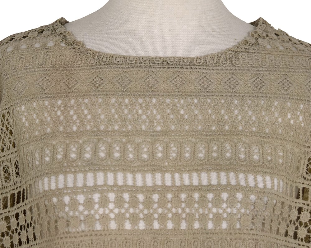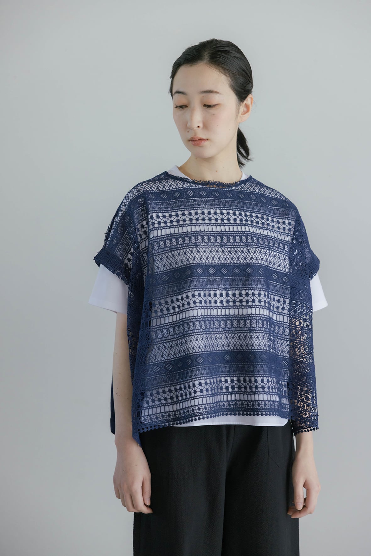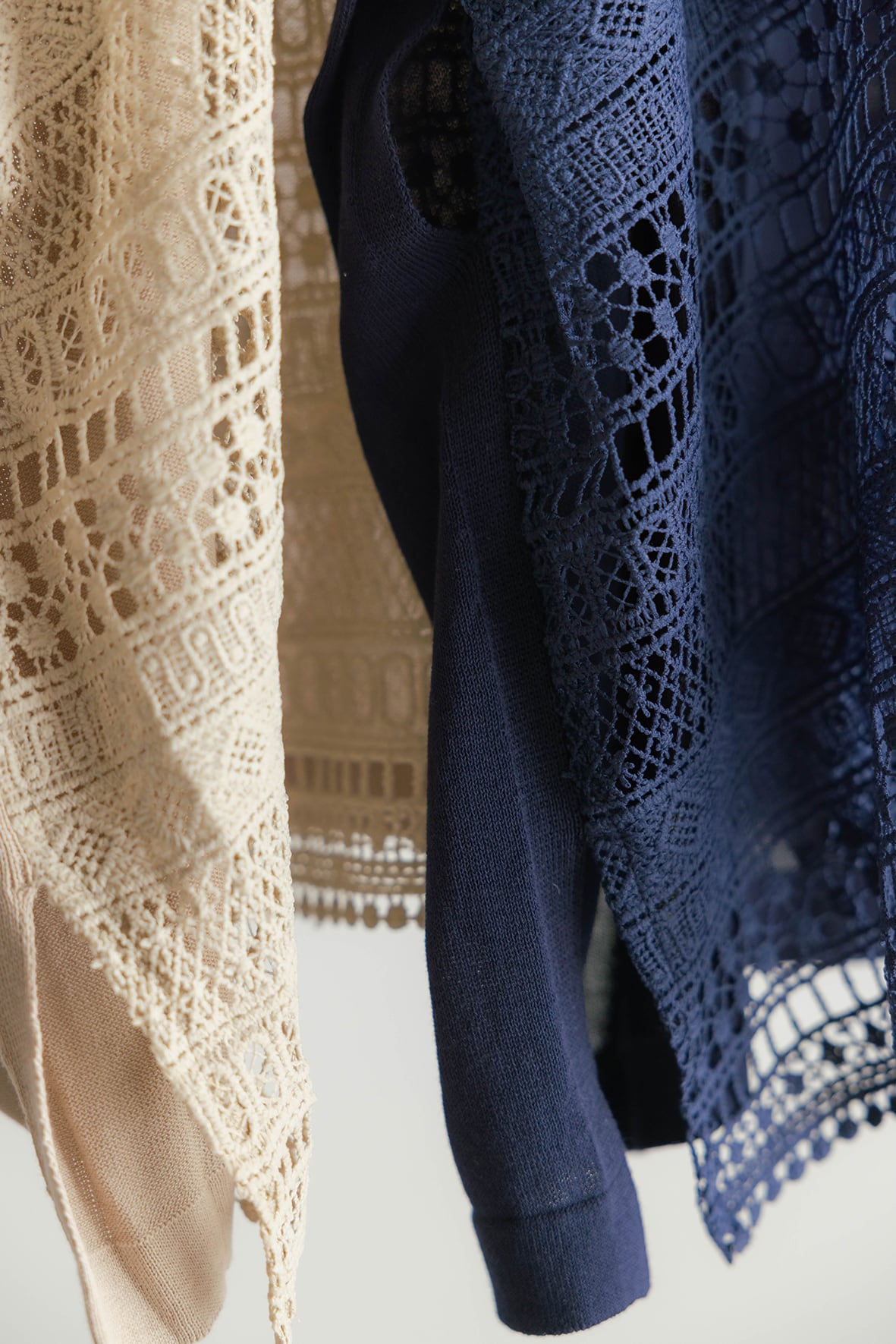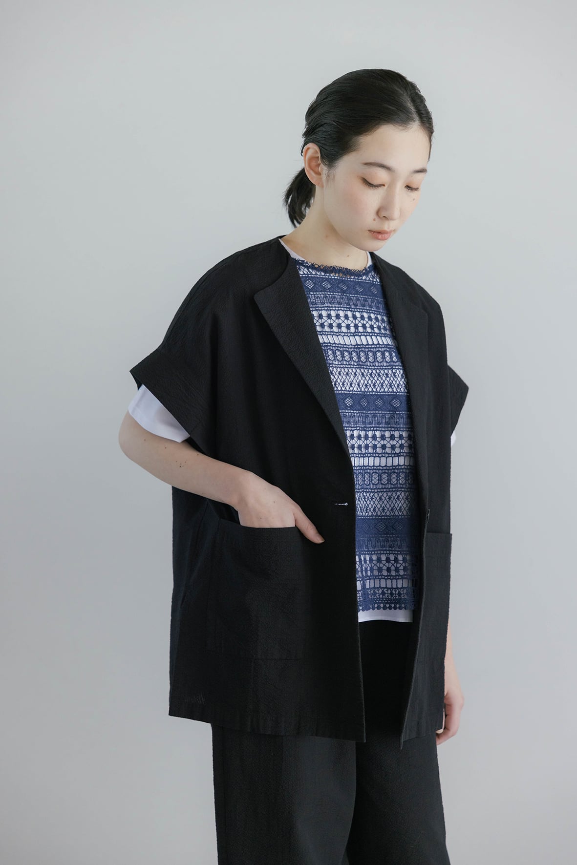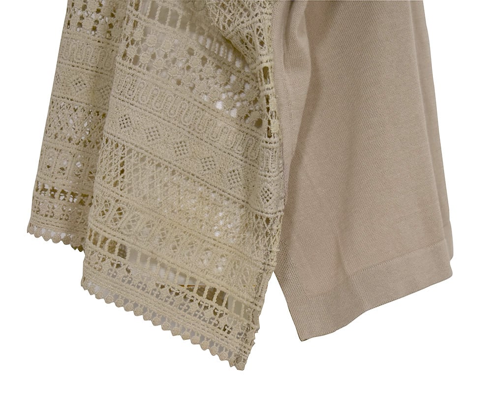 繊細なエンブロイダリーレースとニット編み、前後どちらを前にしても着用できる2WAYベストです。レイヤードスタイルにも取り入れやすく、季節の変わり目にも活躍します。立体感のあるエンブロイダリーレースと、コットン強撚糸を使用したニットの2素材を使用しています。ニット素材は吸湿性にすぐれ、滑らかでドライタッチな肌触りが特徴です。