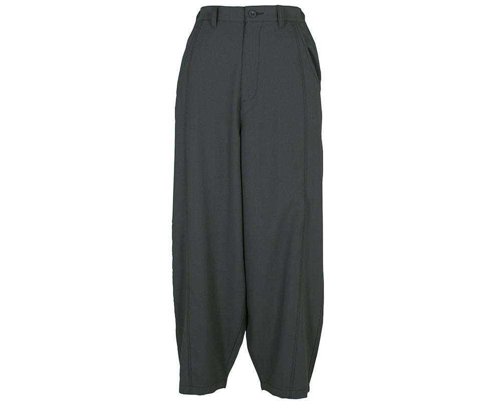 裾に向かってカーブしたシルエットと、脇の切り替えで細見え効果のあるパンツです。少し落ち感のあるポリエステルの生地とライトオンスのデニムの2素材展開。