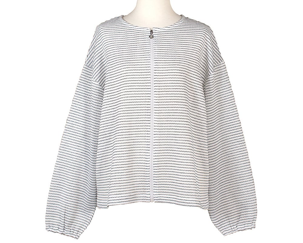フロントジップでさっと羽織れて、しわになりにくく持ち運びにも便利なカットカーディガンです。通気性のよい軽やかな素材で、重ね着してもさらっと快適に着ていただけます。ファスナーの引き手にはあじさいの彫り柄を入れました。