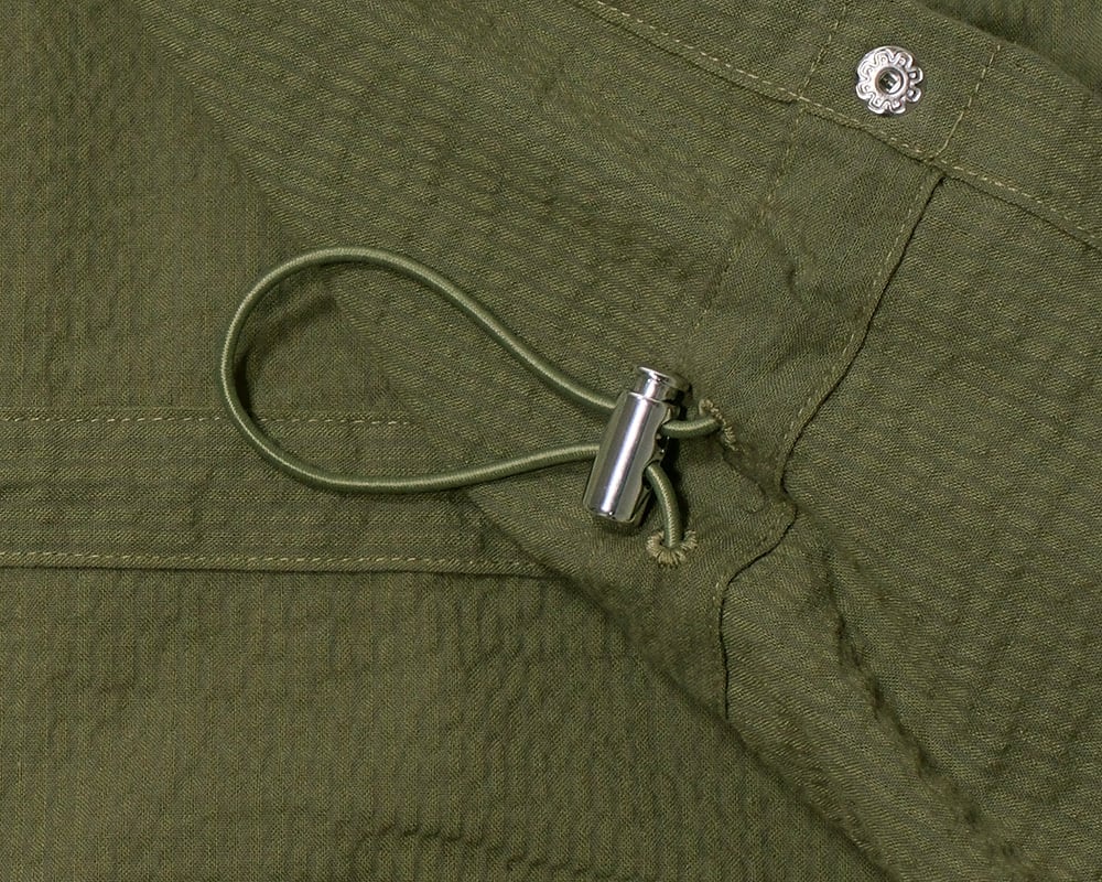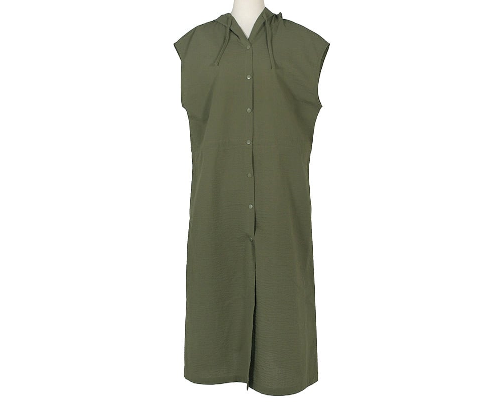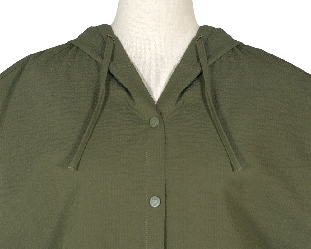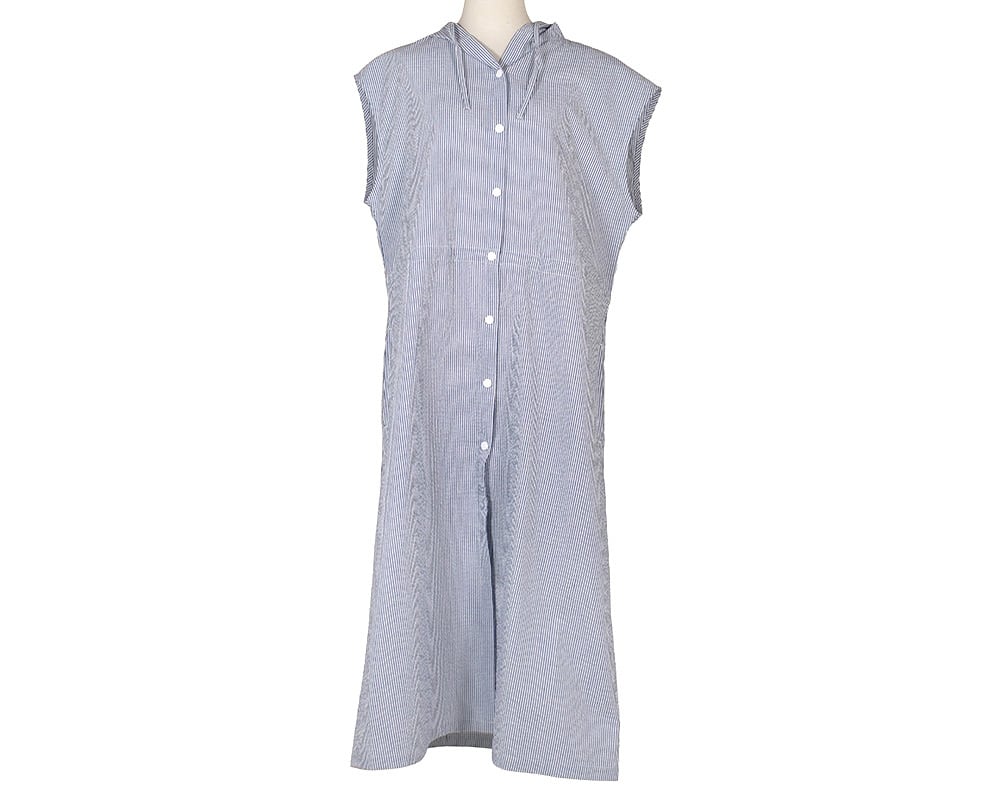 日よけ対策にもなるフード付きデザインのノースリーブワンピースです。ウエストの内側のドロストコードでシルエットの調整も可能です。凸凹のあるさらっとしたサッカー生地で、肌離れがよく暑い日も心地よく着ていただけます。開けて羽織るだけでシンプルコーデも華やぎます。