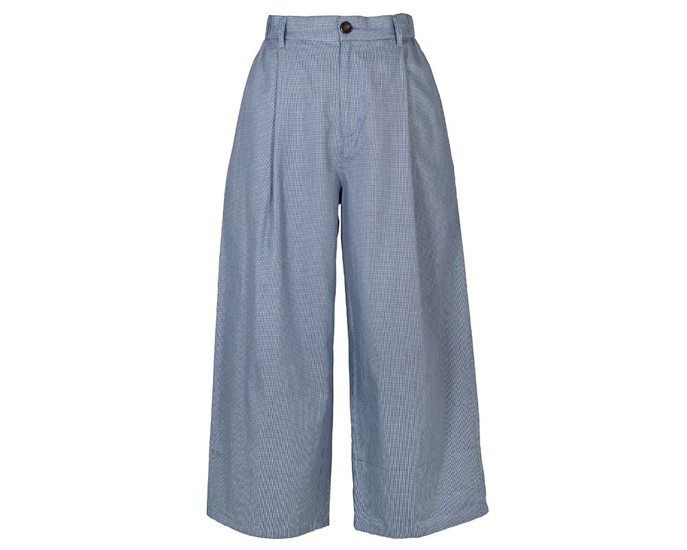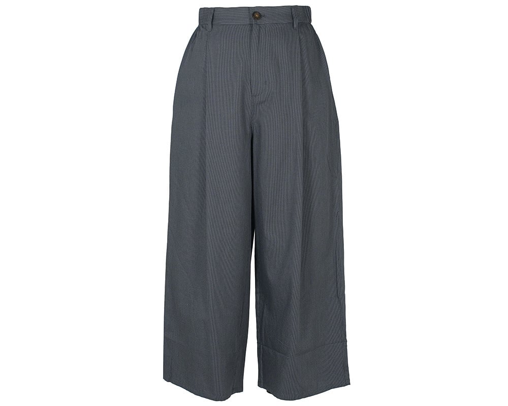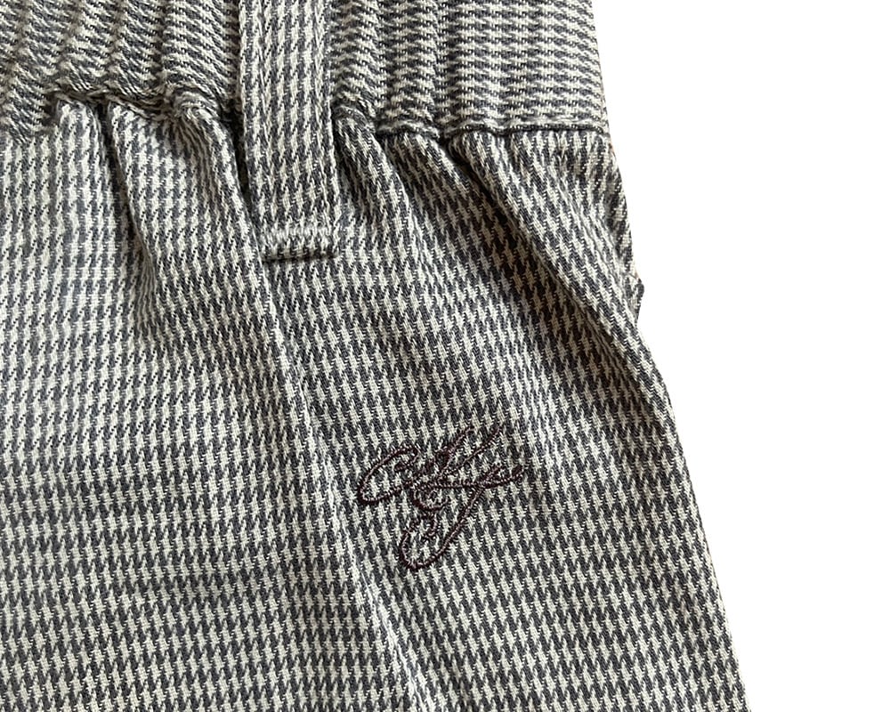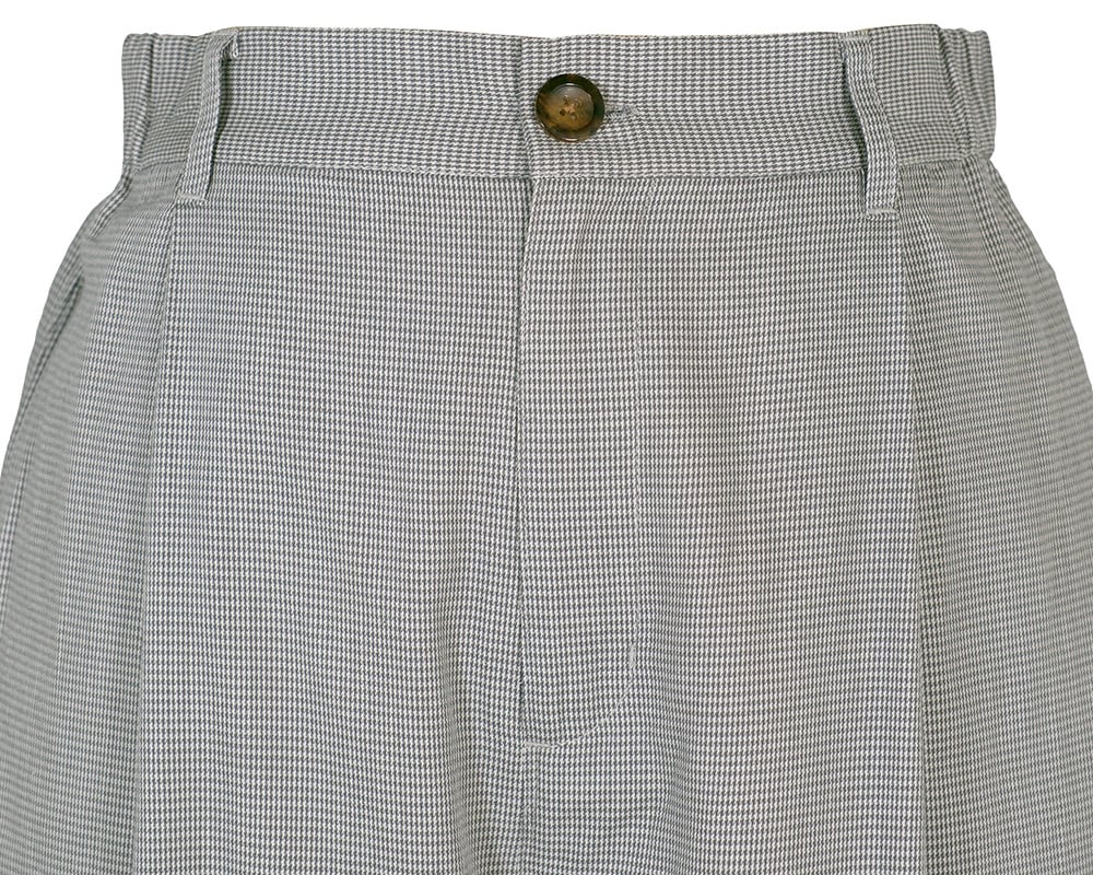先染めのマイクロ千鳥チェック生地を使用した、クラシックな佇まいのワイドパンツ。