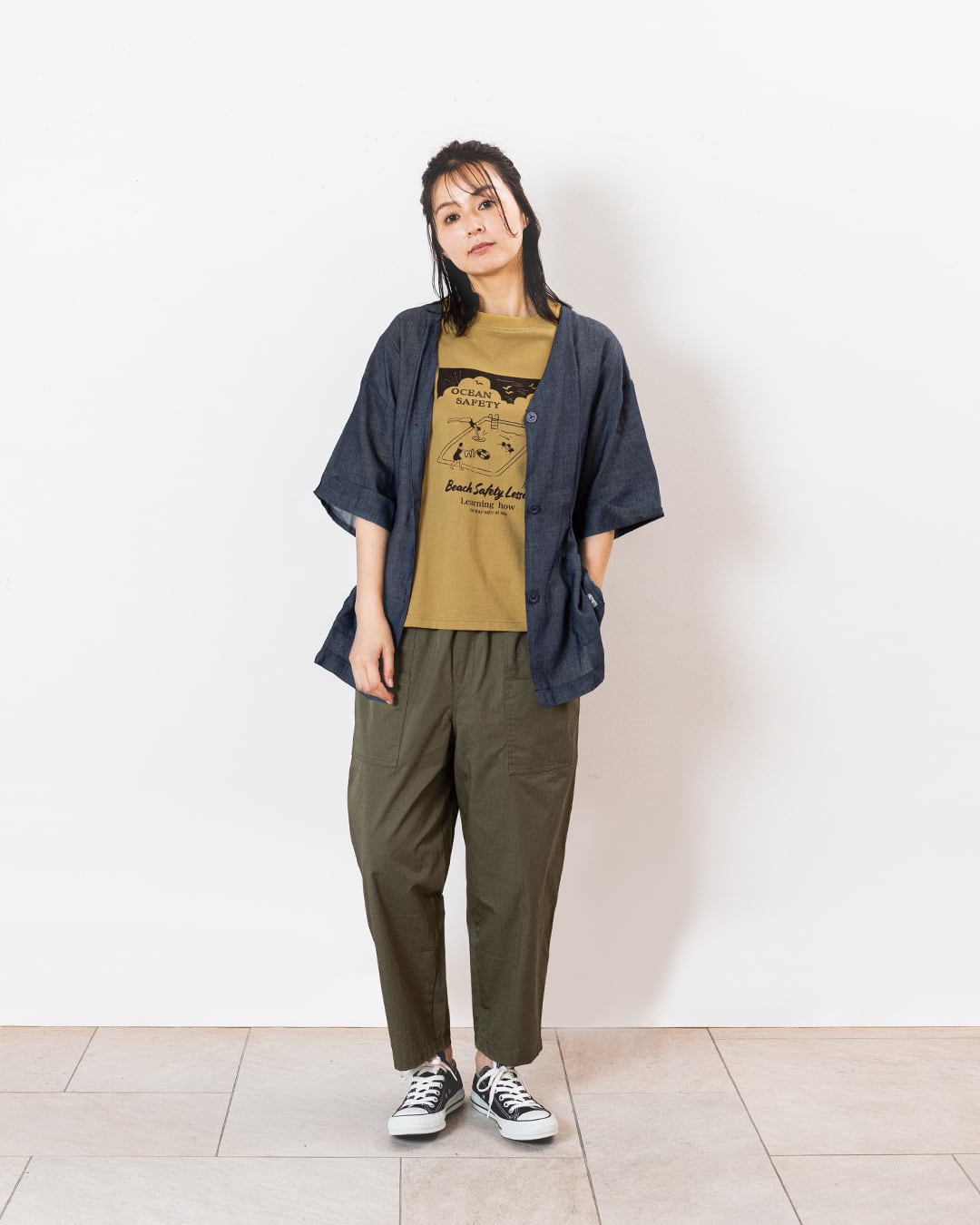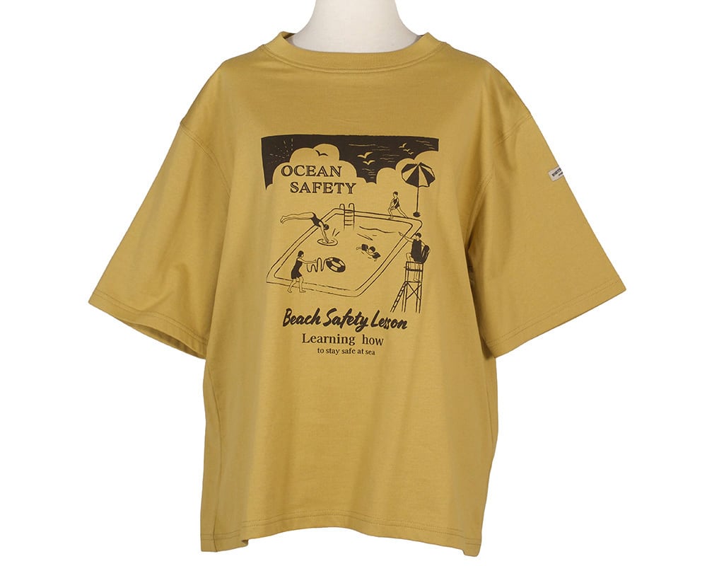 リラックスしたムードの中にユーモアを添えたデザインがポイントです。プリントはコーディネートに存在感を持たせ、袖にあしらったワッペンもさりげないアクセントに。パンツやスカートと合わせるだけで、夏らしいカジュアルスタイルが完成する1枚です。