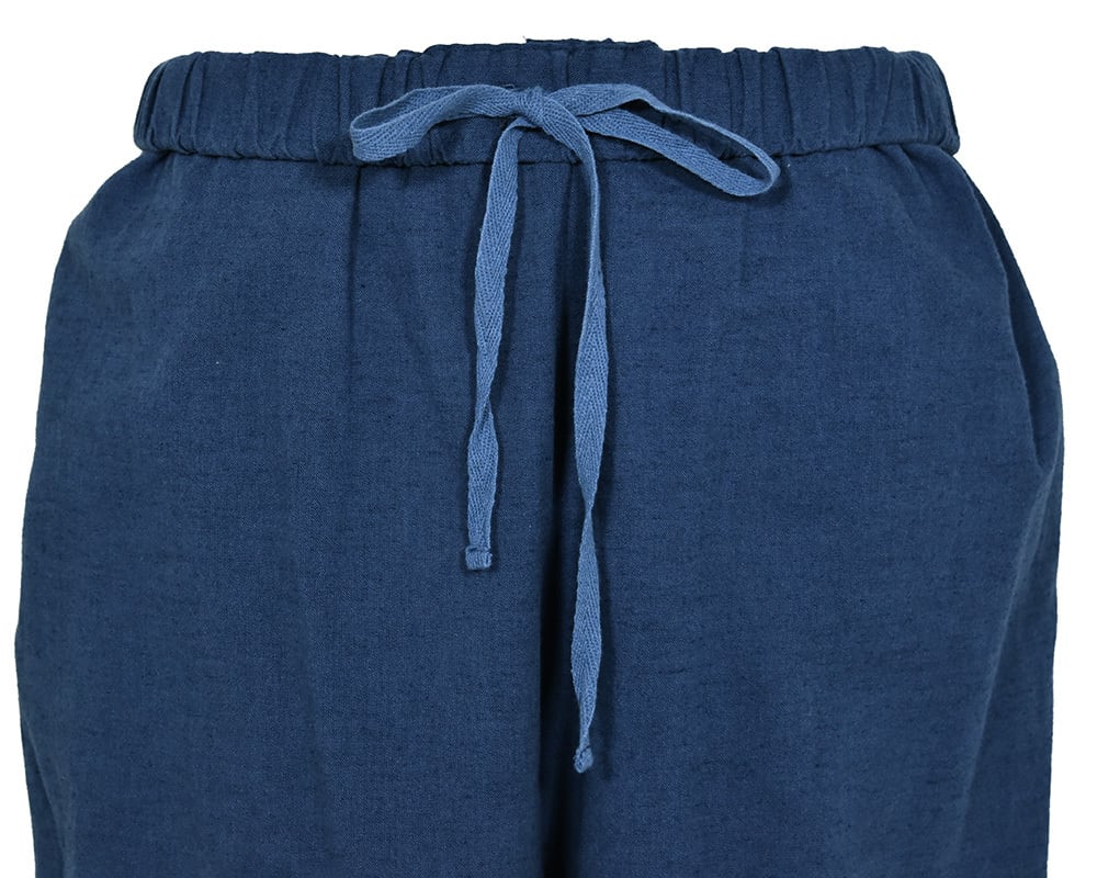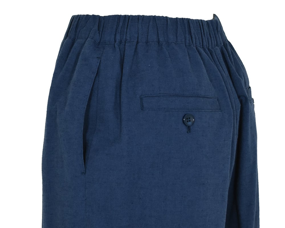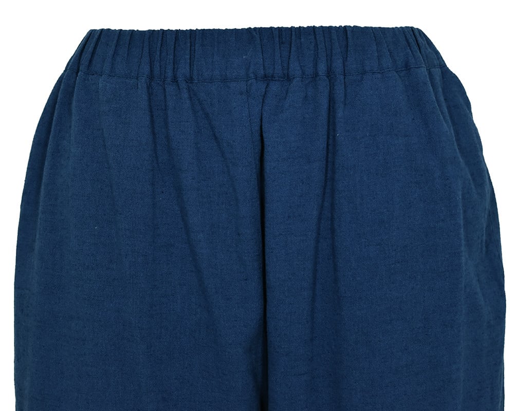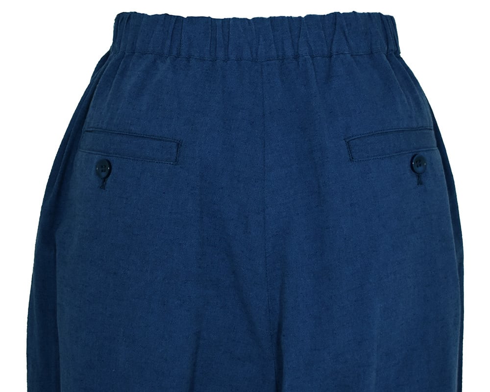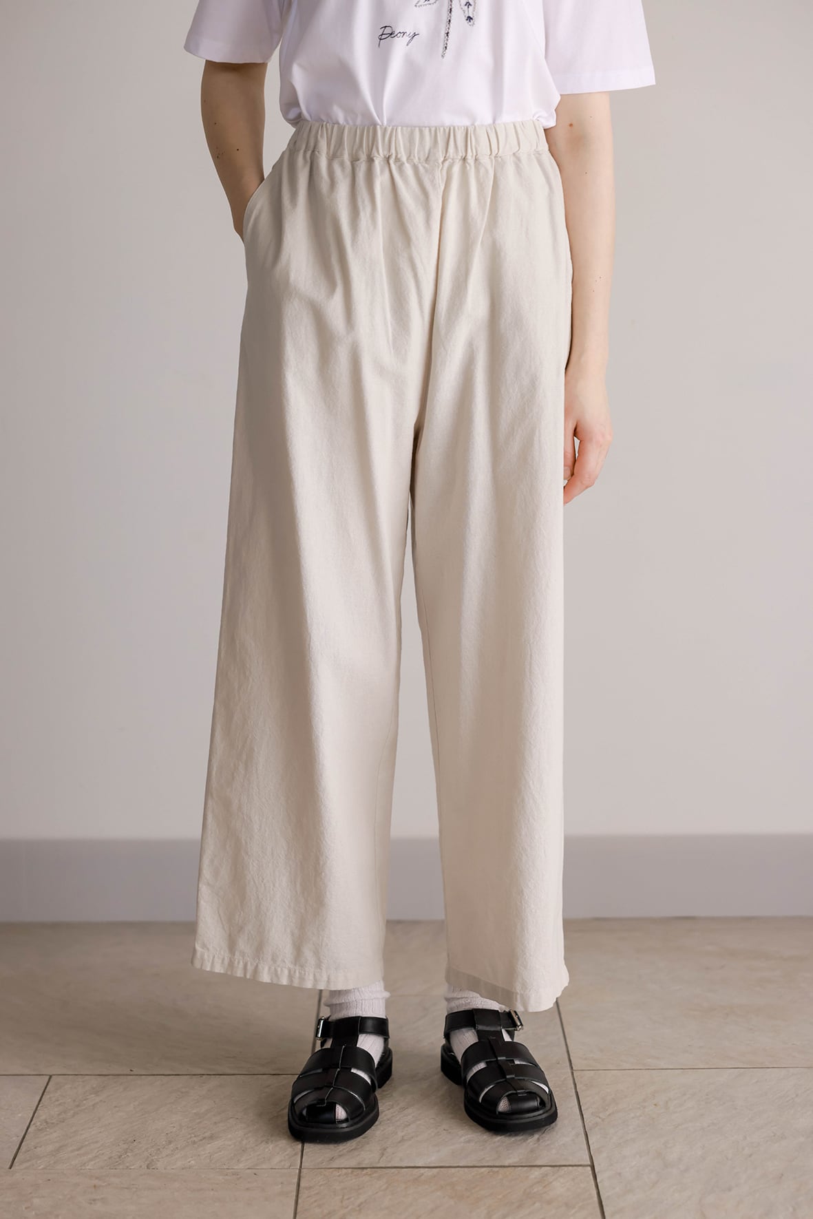 ウエスト総ゴム仕様、内紐入りでウエストのサイズ調整が可能、両脇、後ろポケットあり。