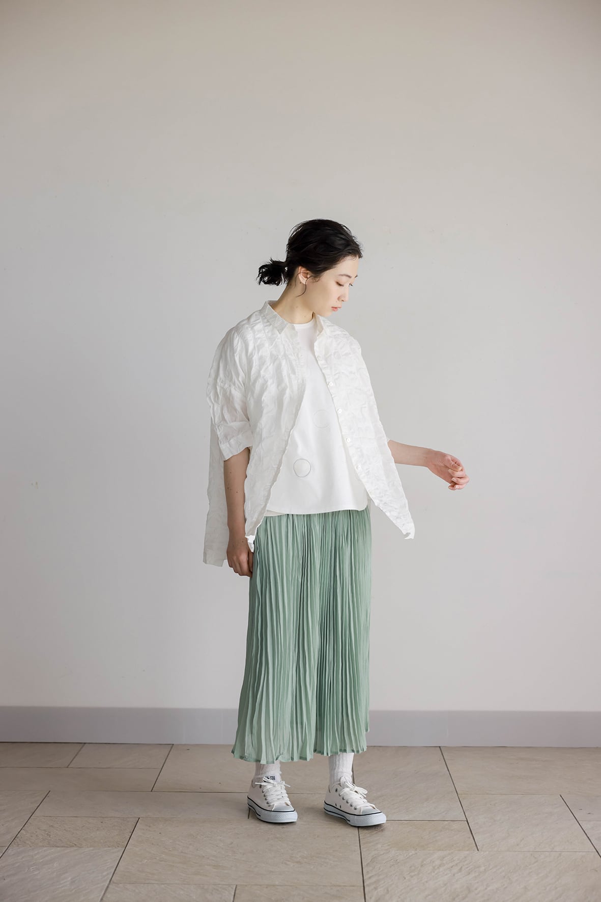 表地は、シボ感のあるマットなシアーポリエステルにランダムプリーツ加工を施した素材です。裏地には薄手のジャージ素材を使用し、軽さと快適さを両立しています。