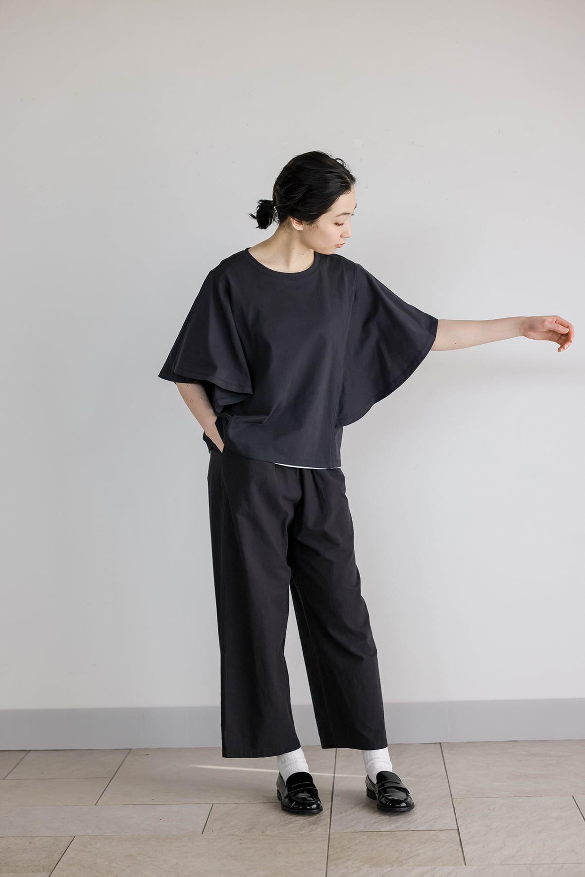 体のラインが響かない程よいゆとりのあるシルエットで気になる二の腕をカバーしてくれるアイテムです。