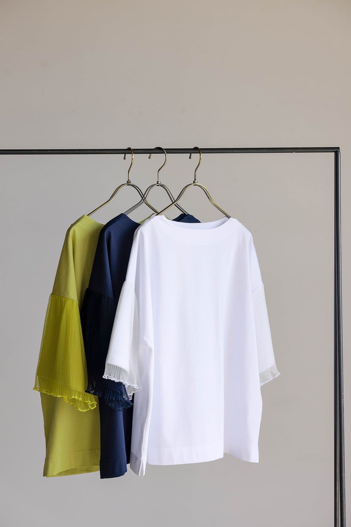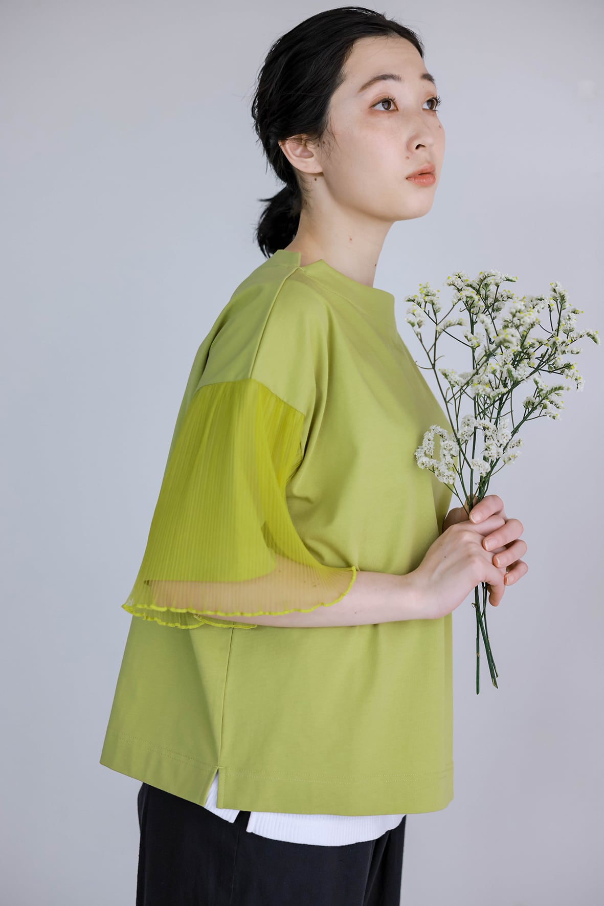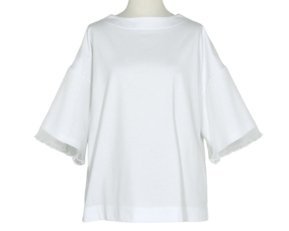 プリーツ加工を施したシアーチュールを重ね、2枚仕立ての袖がポイントのTシャツです。