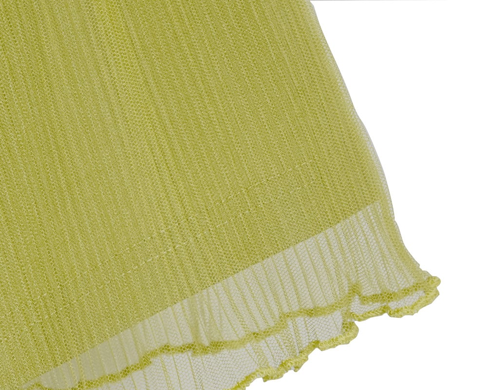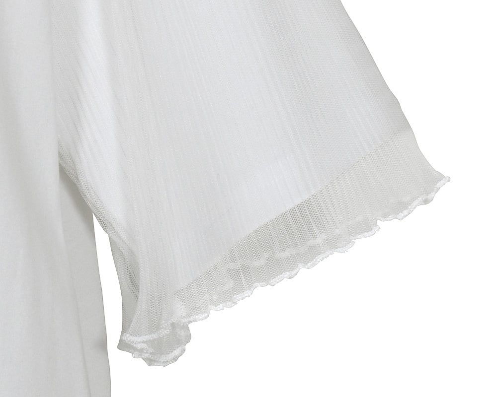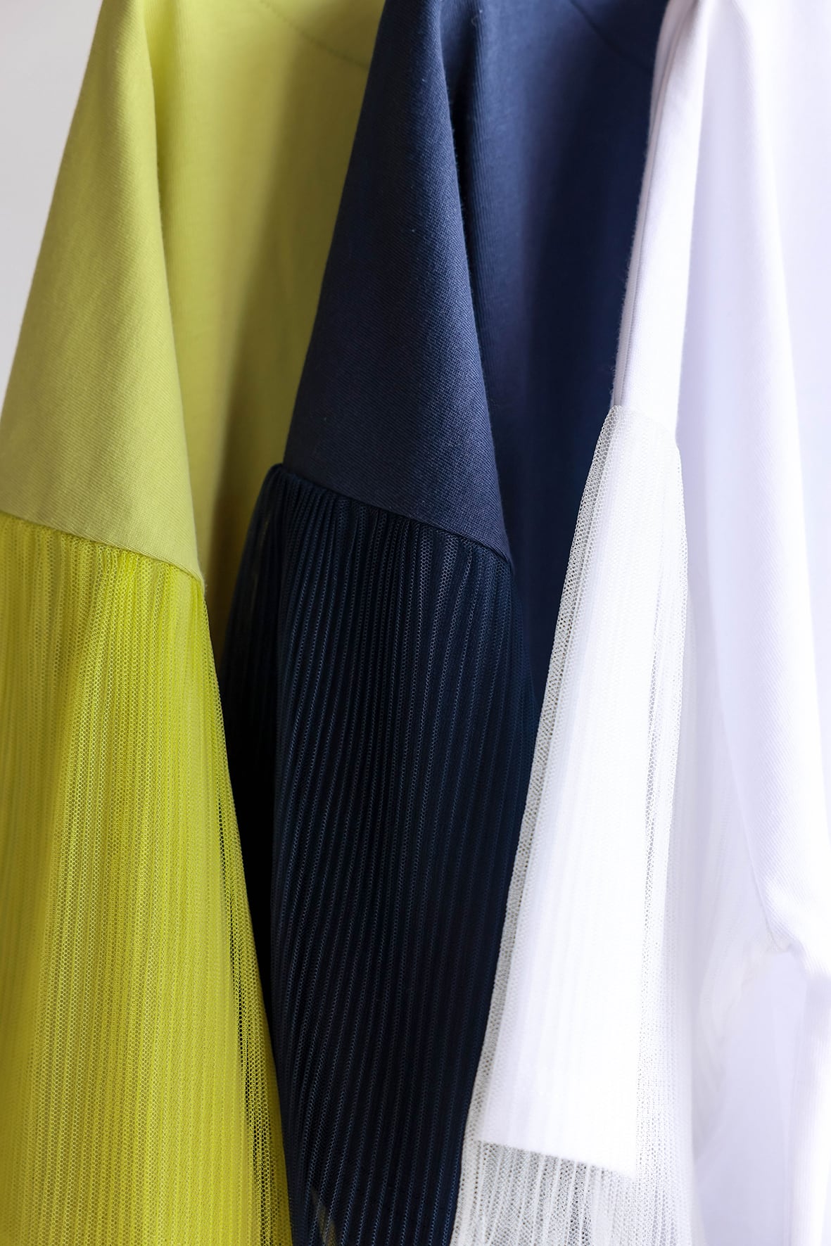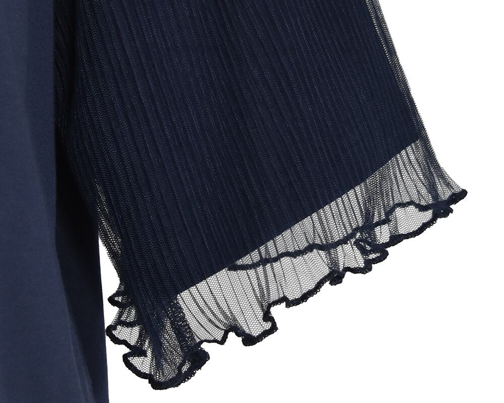 プリーツ加工を施したシアーチュールを重ね、2枚仕立ての袖がポイントのTシャツです。
