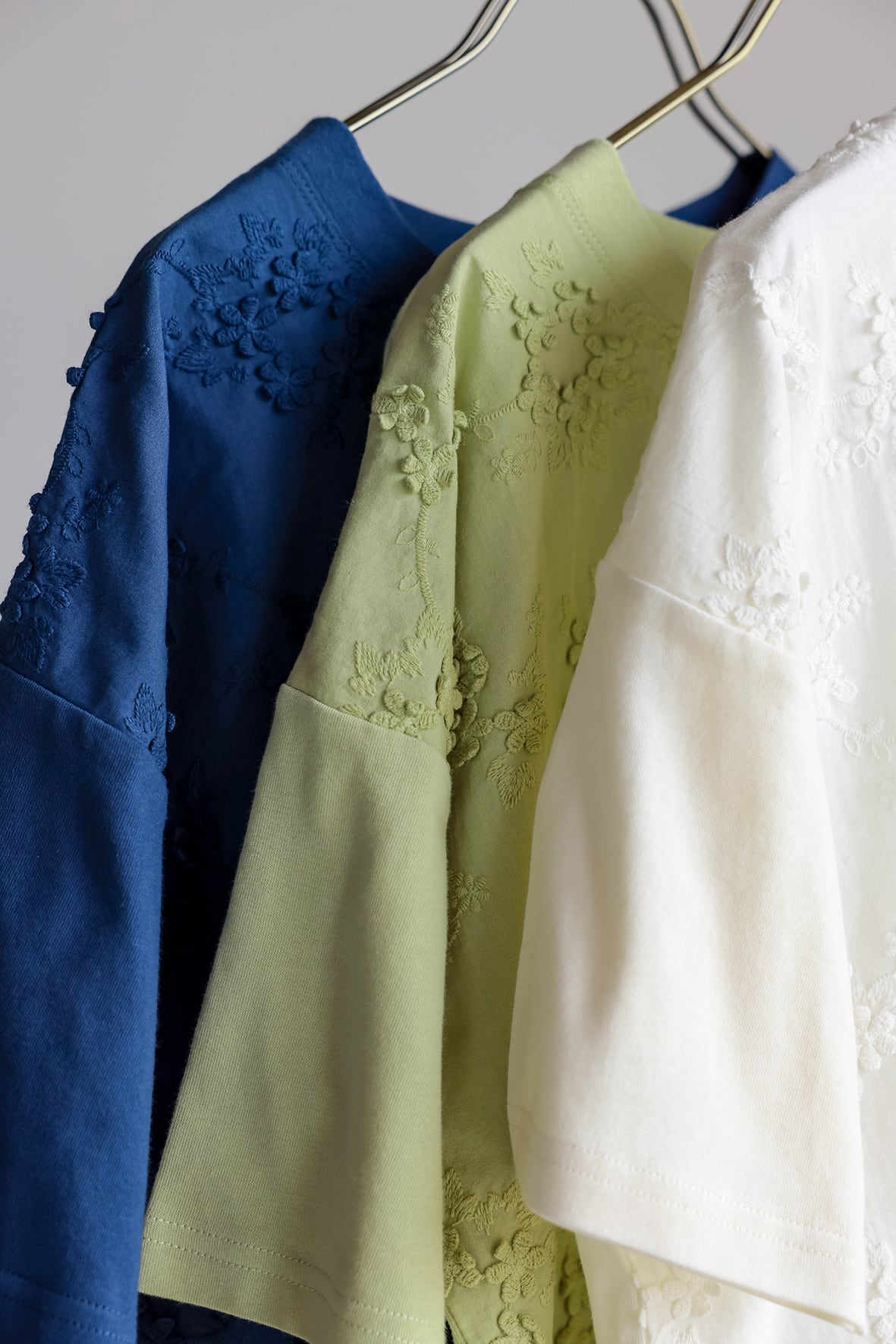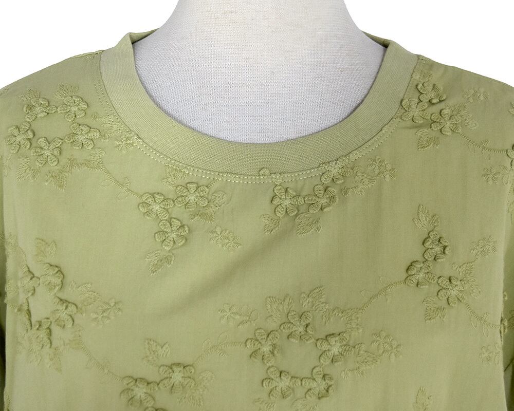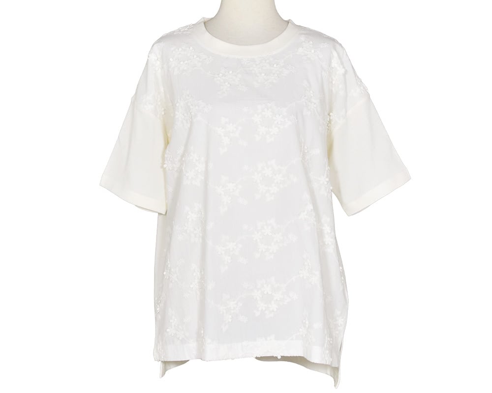 前身頃は刺繍生地、他部分はカットソーで仕立てているので、ブラウスとTシャツの中間的な感覚で着ていただけます