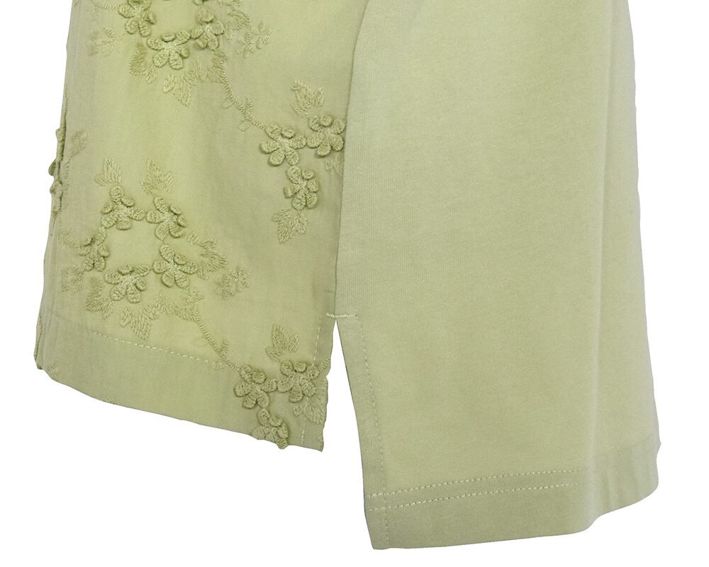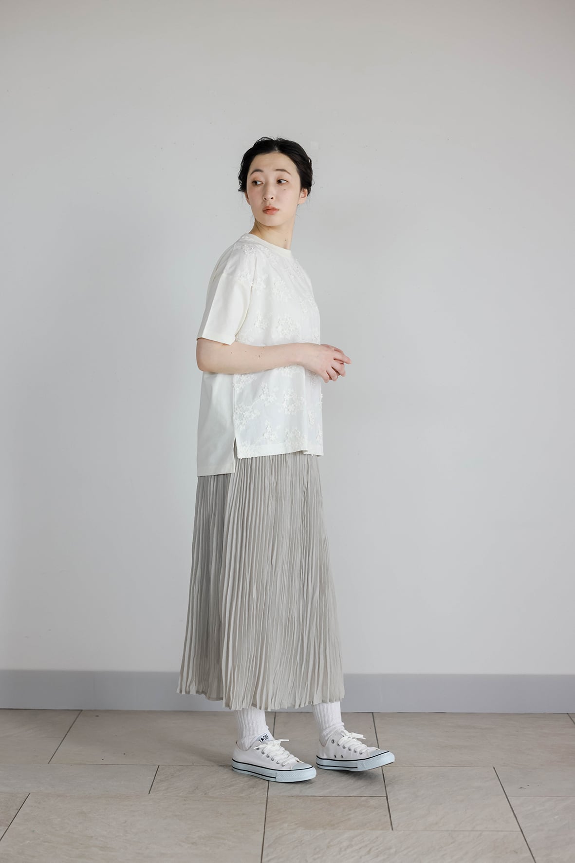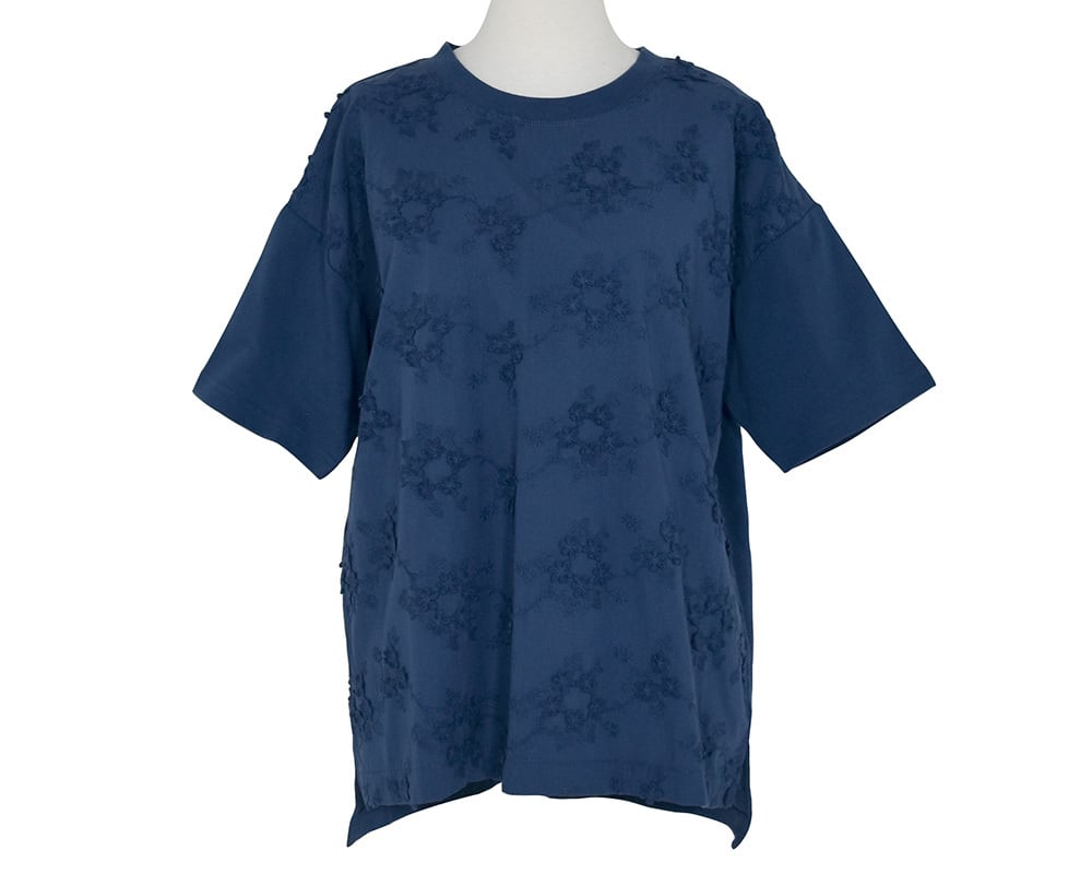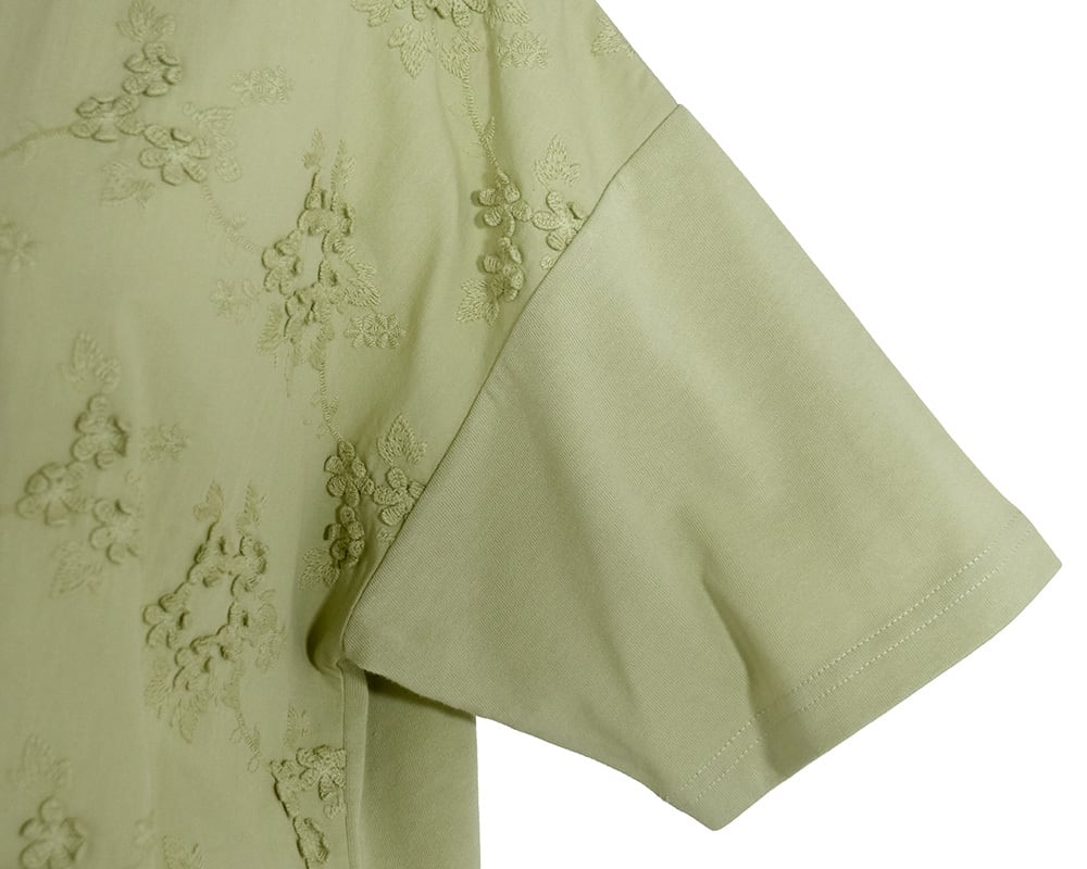 前身頃は刺繍生地、他部分はカットソーで仕立てているので、ブラウスとTシャツの中間的な感覚で着ていただけます