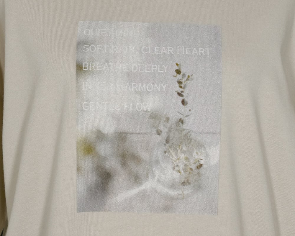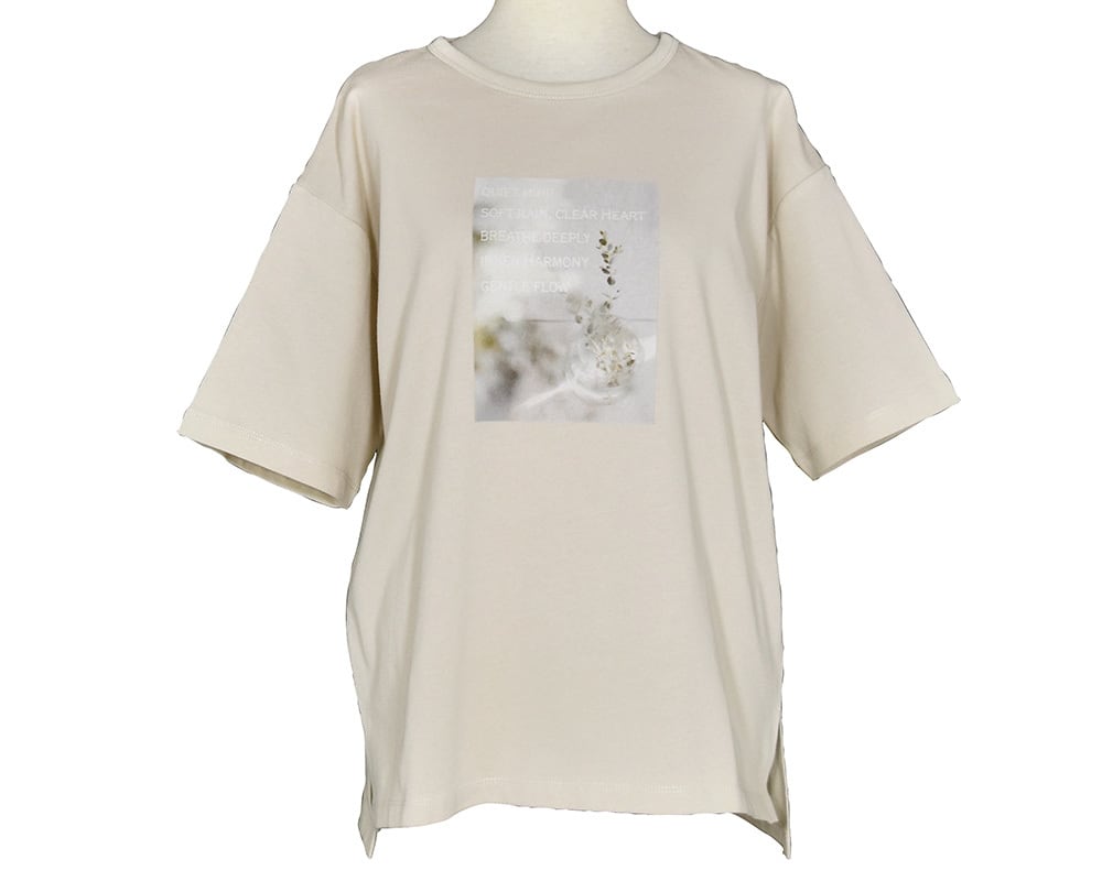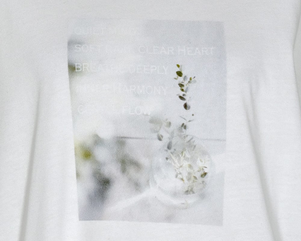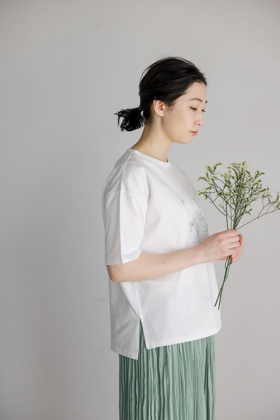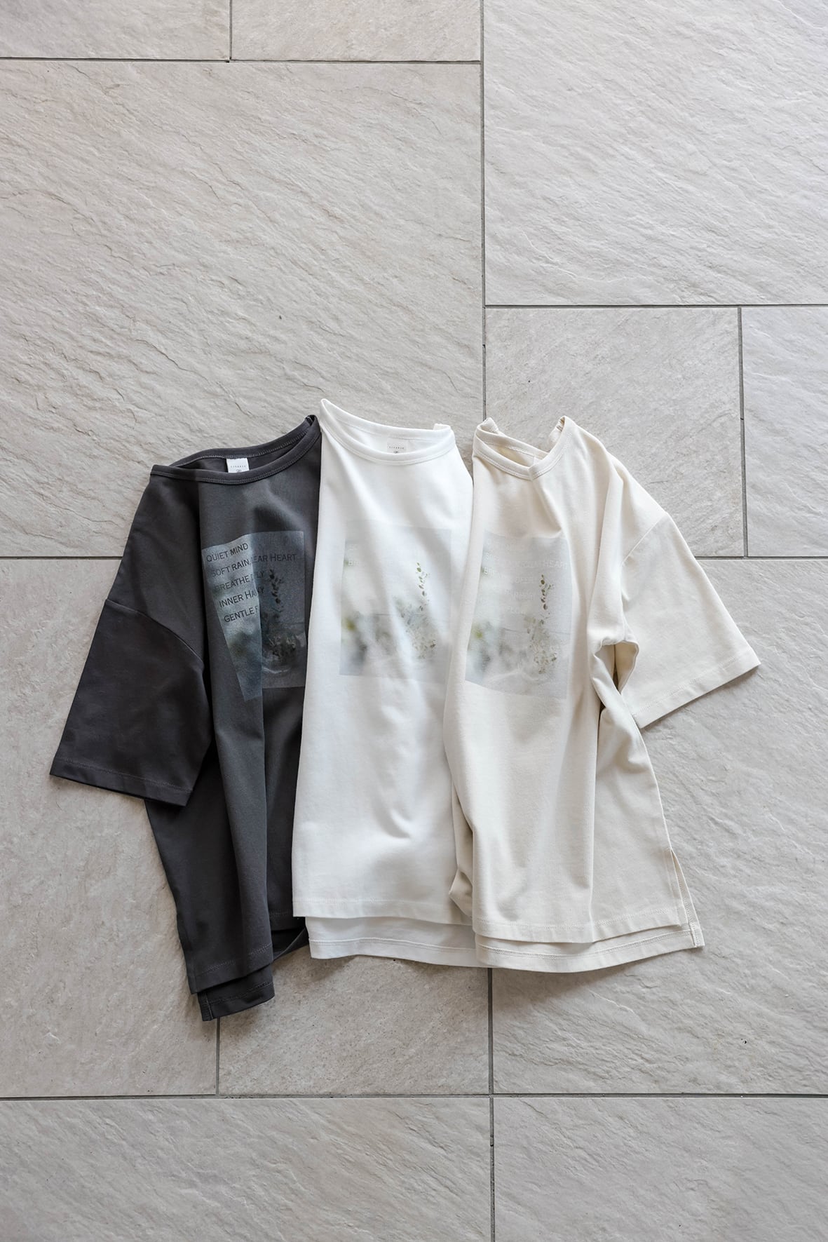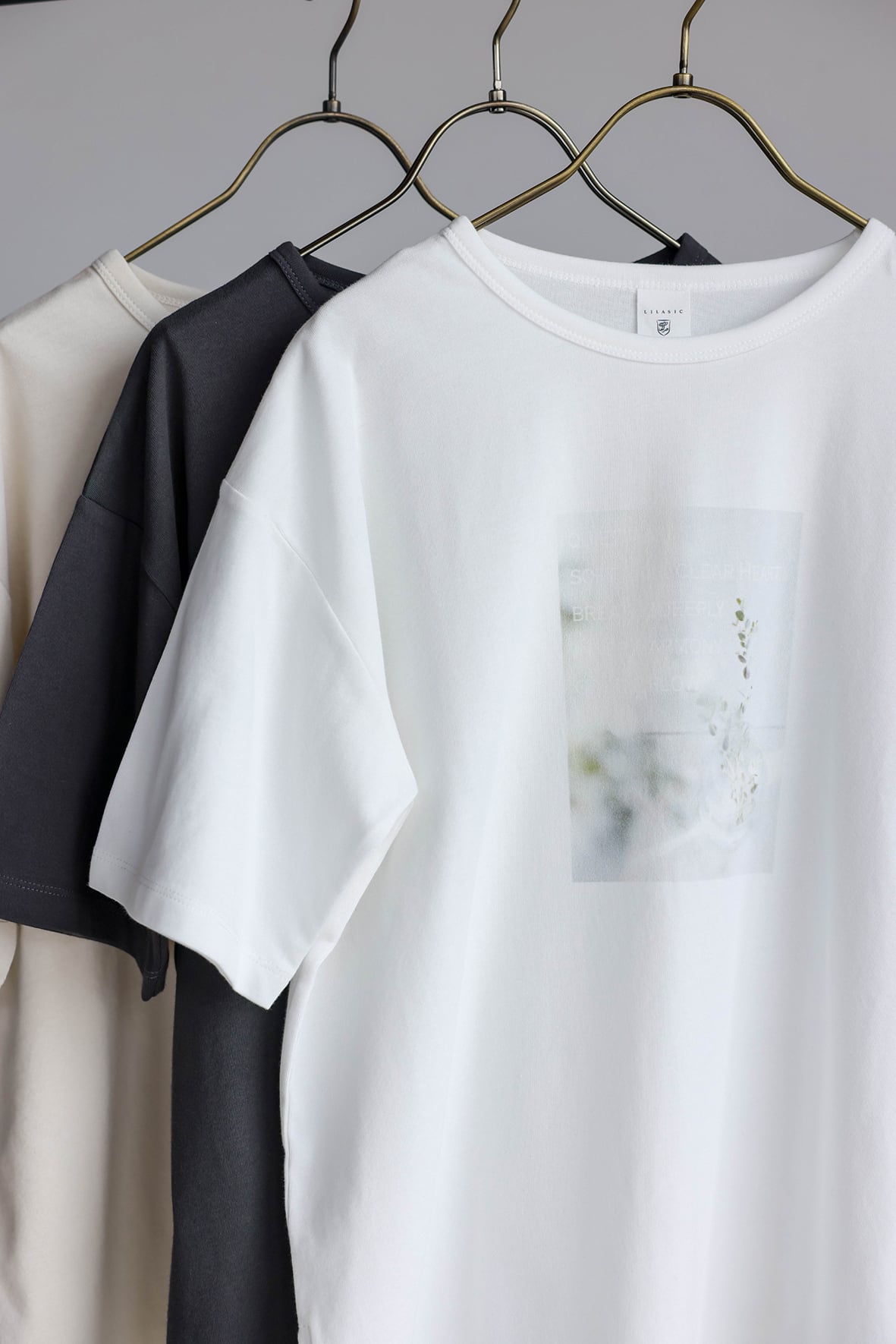 二の腕が隠れる長めの半袖丈のベーシックなサイズ感のTシャツに、フォトプリントを施した一枚です。