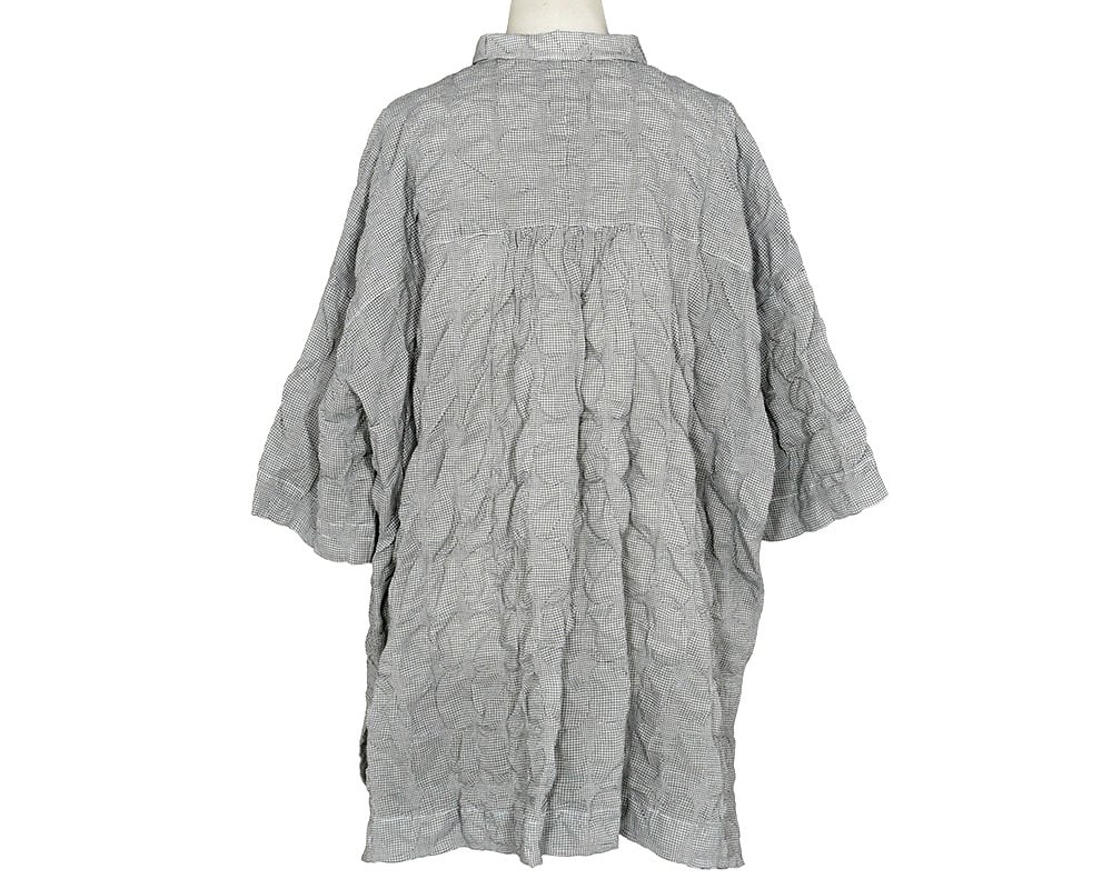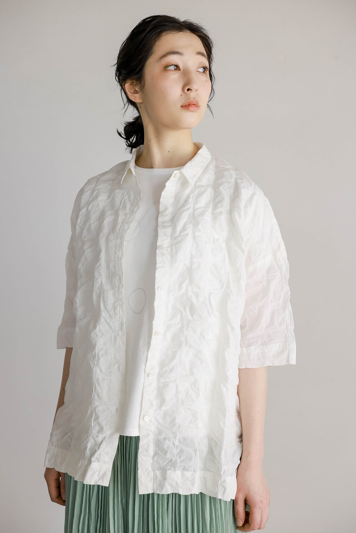 ハリとシャリ感のあるさらりとした肌触りの生地を、立体的な表面感仕上げにより肌に触れる面積が少なく涼やかな着心地です